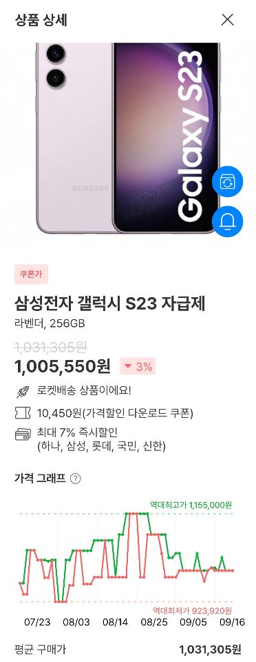 갤S23처럼 사려는 상품 추가해놓으면 가격 떨어지거나 최저가일때 알림도 해줌