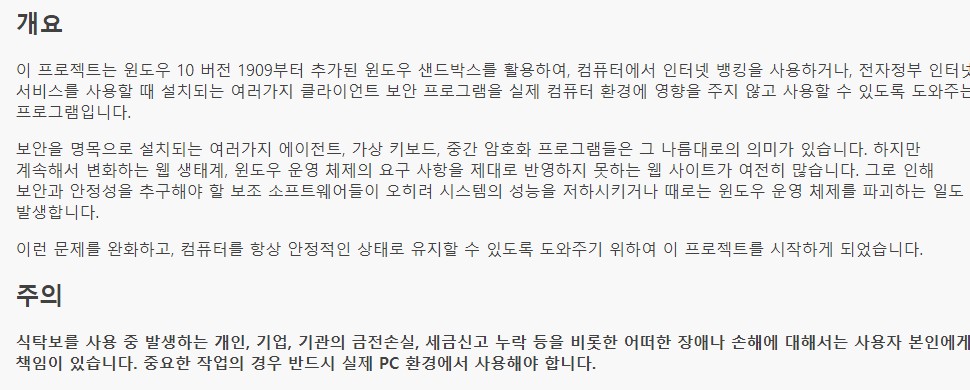 윈도우 샌드박스를 이용하기떄문에 기본적으로 가상화(vt-x) + 샌드박스 기능을 켜주셔야합니다.