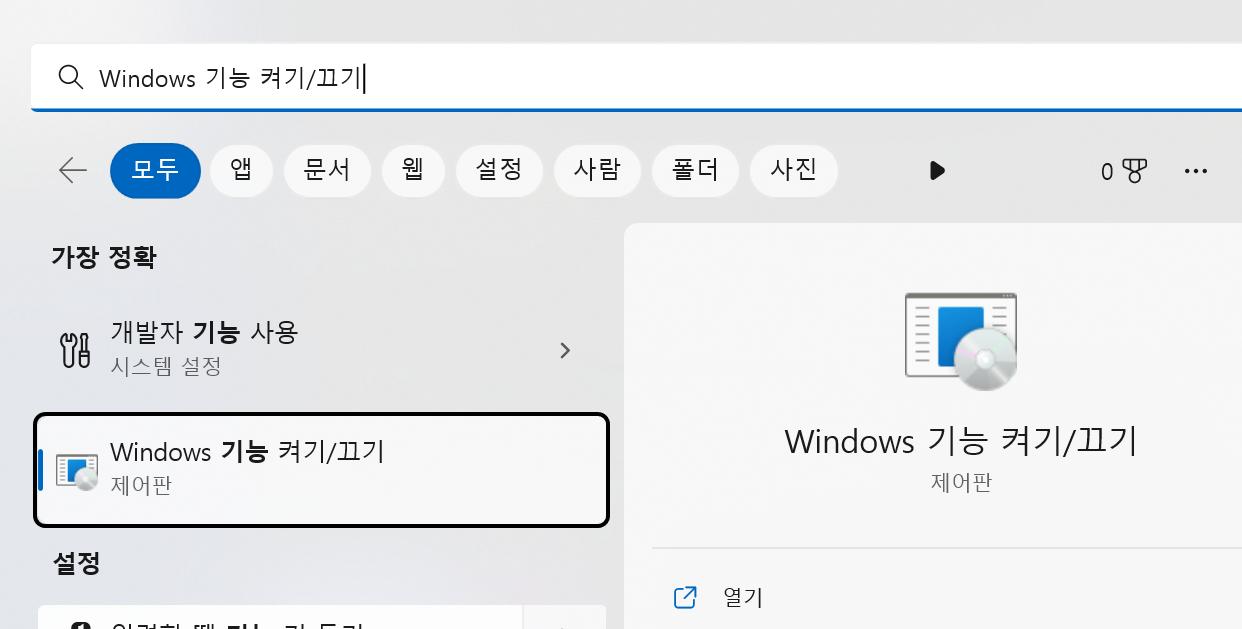 시작 -> Windows 기능 켜기/끄기