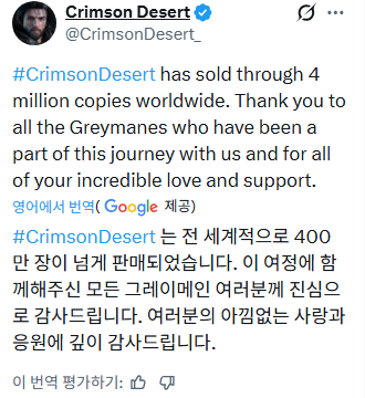 붉은사막 400만장 돌파 작성자good4611|작성시간26.04.01|조회수1,866 목록 댓글 1 글자크기 작게가 글자크기 크게가 출처 : https://x.com/CrimsonDesert_/status/2039160829539701103?s=20 다음검색 현재 게시글 추가 기능 열기 북마크 공유하기 신고 센터로 신고 댓글 댓글 1 댓글쓰기 답글쓰기 댓글 리스트 작성자왓삐 | 작성시간 26.04.01 new 기세가 대단하네 댓글 전체보기