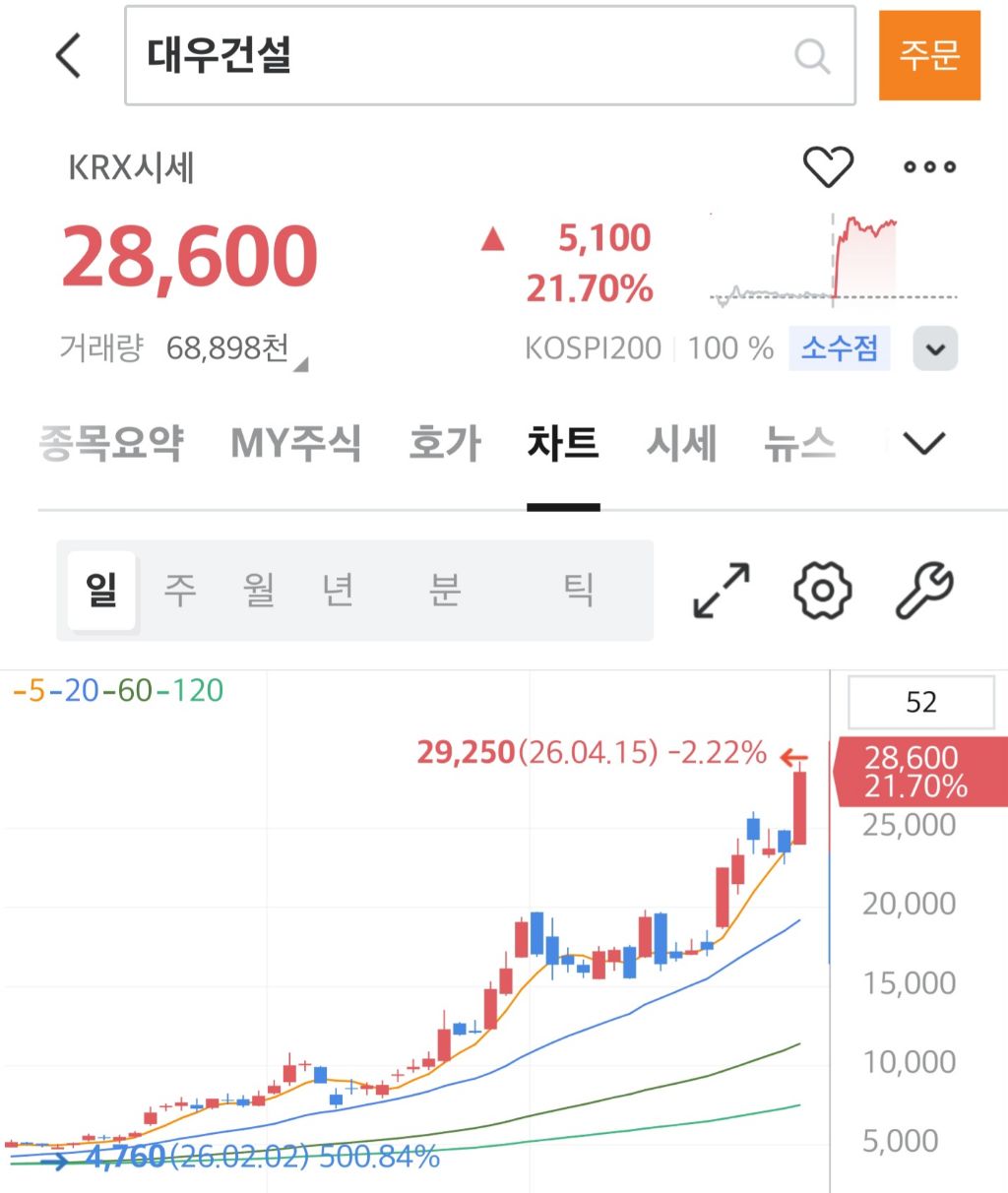 대우건설 엄청 올랐네요 작성자이별의 온도|작성시간26.04.15|조회수473 목록 댓글 2 글자크기 작게가 글자크기 크게가 2월 초 대비 500% ㄷㄷ 다음검색 현재 게시글 추가 기능 열기 북마크 공유하기 신고 센터로 신고 댓글 댓글 2 댓글쓰기 답글쓰기 댓글 리스트 작성자꿀벌대장 | 작성시간 26.04.15 new 전쟁나면 건문다시올려야 하니까? 작성자츠노마키 와타메 | 작성시간 26.04.15 new 적자부문 제거, 원자력 수주 가능성, 민주당 정치자금썰 등이 있다고하네요 댓글 전체보기