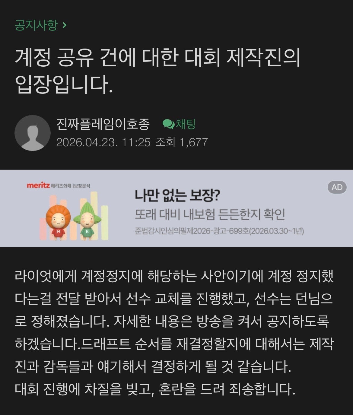 호종컵 탑 던으로 교체 작성자Ryuna|작성시간26.04.23|조회수767 목록 댓글 19 글자크기 작게가 글자크기 크게가 그나마 대회전에 터진게 불행중 다행인듯 다음검색 현재 게시글 추가 기능 열기 북마크 공유하기 신고 센터로 신고 댓글 댓글 19 댓글쓰기 답글쓰기 댓글 리스트 작성자에스로반 | 작성시간 26.04.23 대회종료 장현재 우승 작성자해달별 | 작성시간 26.04.23 별거도 아니네 작성자사직서를가슴속에 | 작성시간 26.04.23 연습모드는 좀 아쉽네 성장하는게 보이던데 작성자허브라이프 | 작성시간 26.04.23 저런... 작성자Dnstory | 작성시간 26.04.23 계정공유라길래 랭대리급인줄 알았더니 연습모드 뭐 라이엇 정책이 계정공유 금지긴한데 흠... 대회는 아쉬운거지 댓글 전체보기