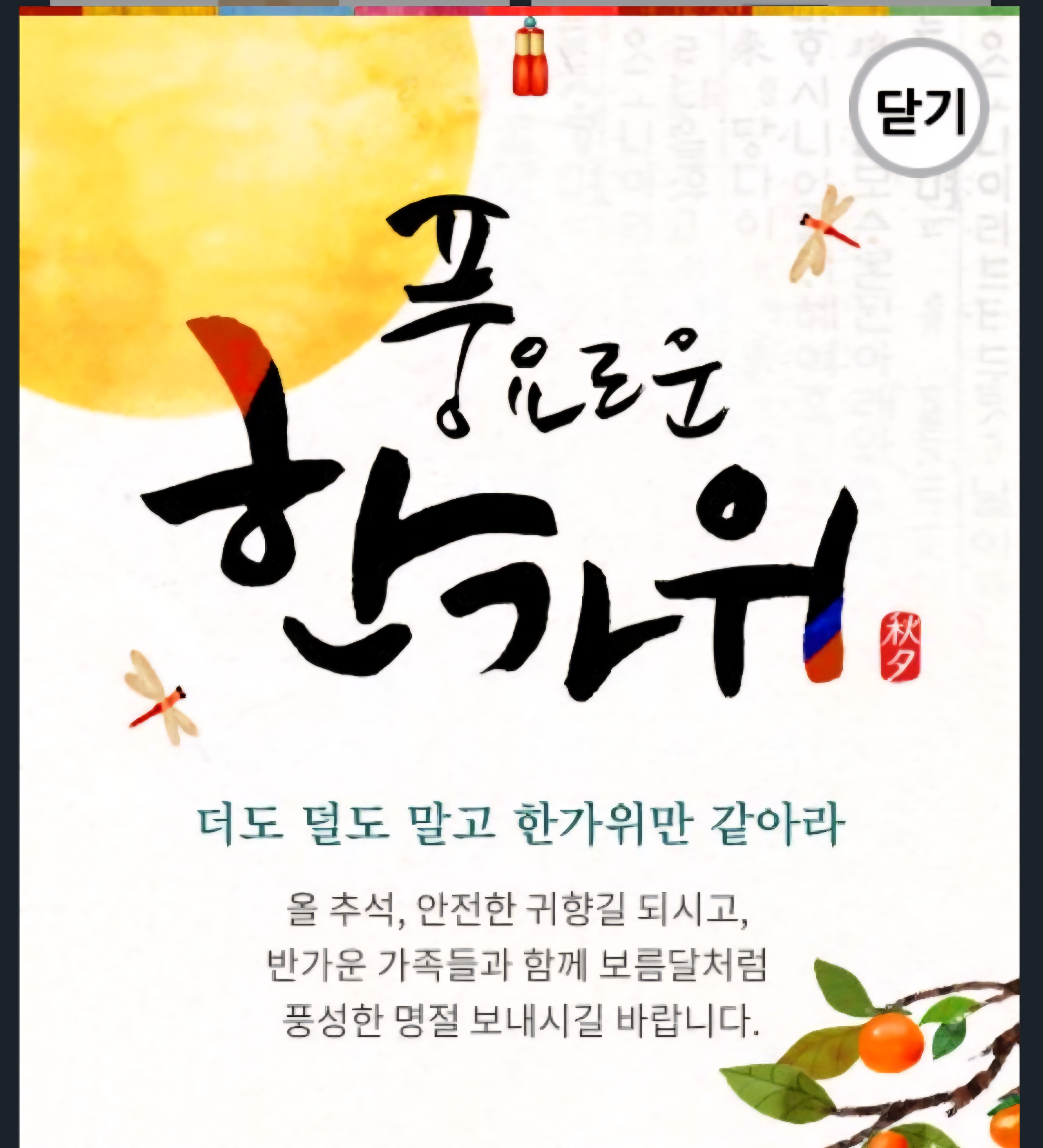 행복한 한가위 되세요 작성자용마(조승범)|작성시간25.10.03|조회수64 목록 댓글 0 글자크기 작게가 글자크기 크게가 온가족 과 함께 하는 풍성하고 행복한 건강하고즐거운 명절 보내시기를 바랍니다 고향 가시는길 오시는길 안전하고편안한 길도 함께하시길 기원합니다 다음검색 현재 게시글 추가 기능 열기 북마크 공유하기 신고 센터로 신고 댓글 댓글 0 댓글쓰기 답글쓰기 댓글 리스트
