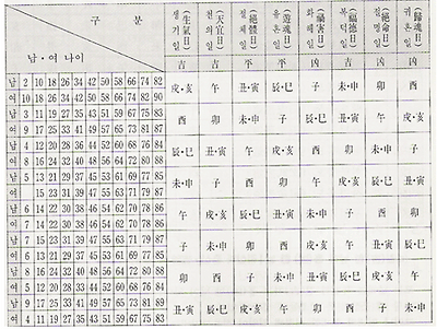 ★ 찾는 방법 : 먼저 택일하고자 하는 사람의 남, 여 별 나이를 보고 택일하고자 하는 날의 일진(日辰)을 보아 좋고, 나쁨을 가린다.