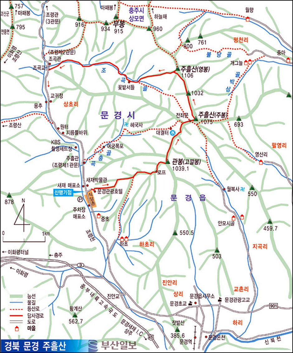 A코스:문경 세재 주차장(산행출발) ☞제1관문☞여궁폭포☞혜국사☞주봉1078m☞ 주능선☞주흘산 영봉 1106m☞제2관문☞조령쉄터☞문경 새제세트장☞