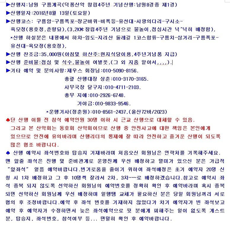 운영진 회의결과 남원 구룡계곡으로 장소 변경하게 되었으니