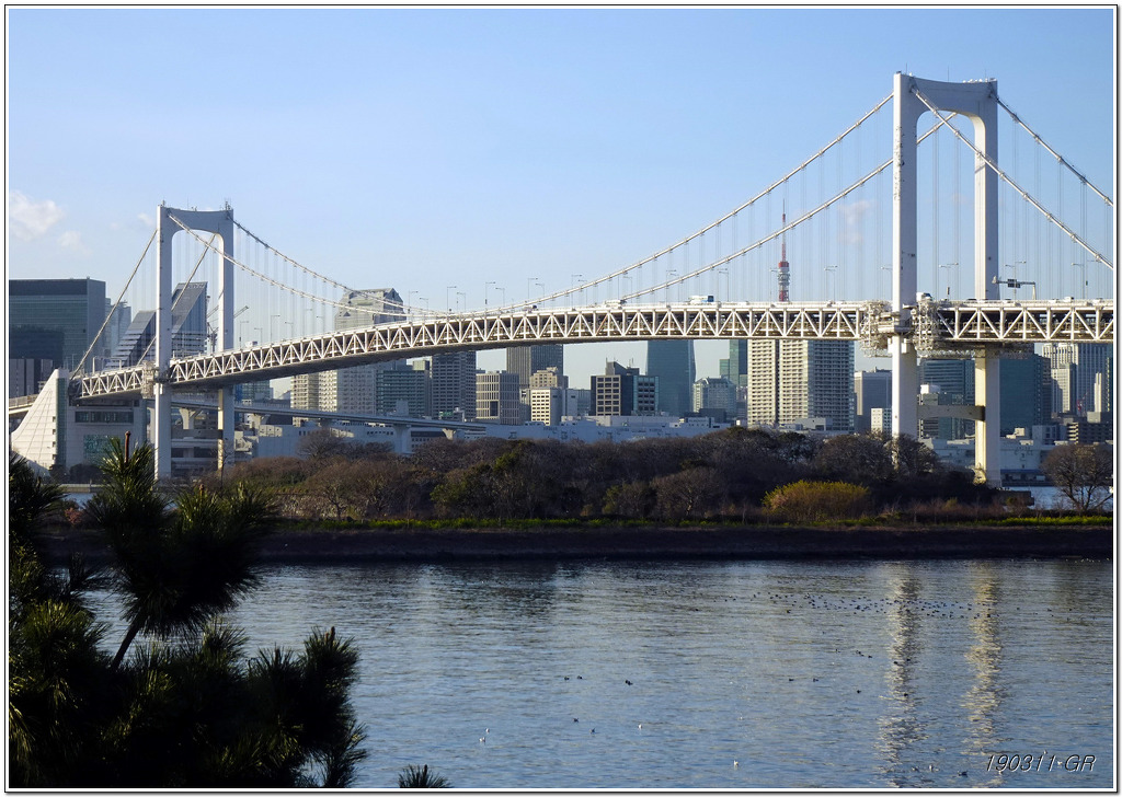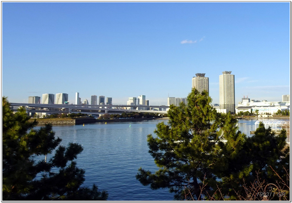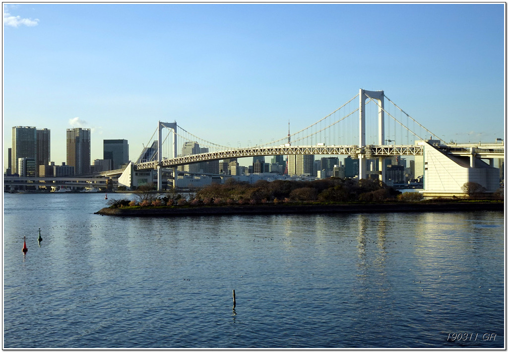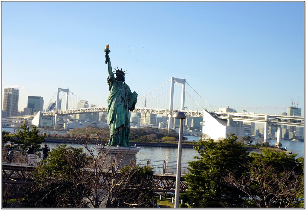 그리고 해변 공원엔 자유의 여신상과 멀리 레인보브릿지가 아름다운 조화를 이룬다.