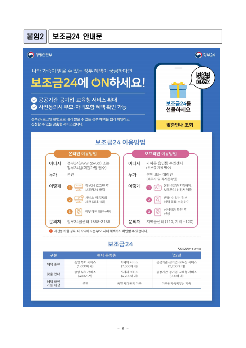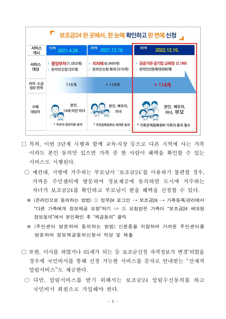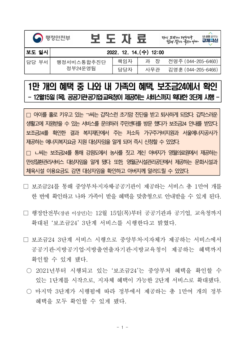 - 221215 (조간) 1만 개의 혜택 중 나와 내 가족의 혜택 보조금24에서 확인(행정서비스통합추진단 정부24운영팀).pdf [ 717.5 KB ] 바로보기