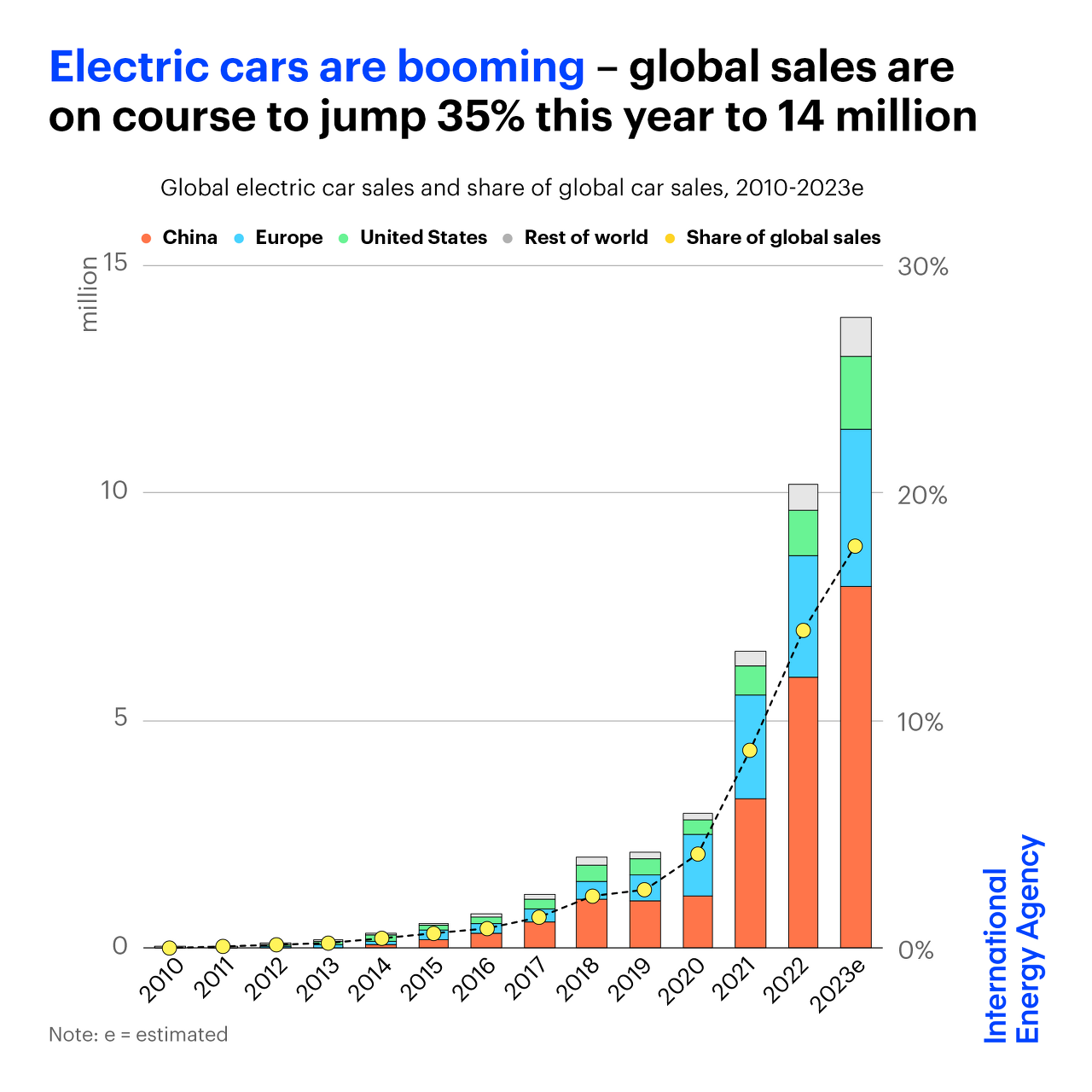 | 전기 자동차 판매가 급증하고 있습니다.2023년 1분기에 230만 대 이상이 판매되었는데, 이는 작년 동기 대비 약 25% 증가한 수치입니다.우리는 현재 2023년 말까지 1,400만 개의 매출을 예상하고 있습니다.Global Electric Vehicle Outlook에서 자세히 알아보십시오. |