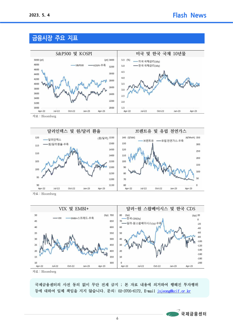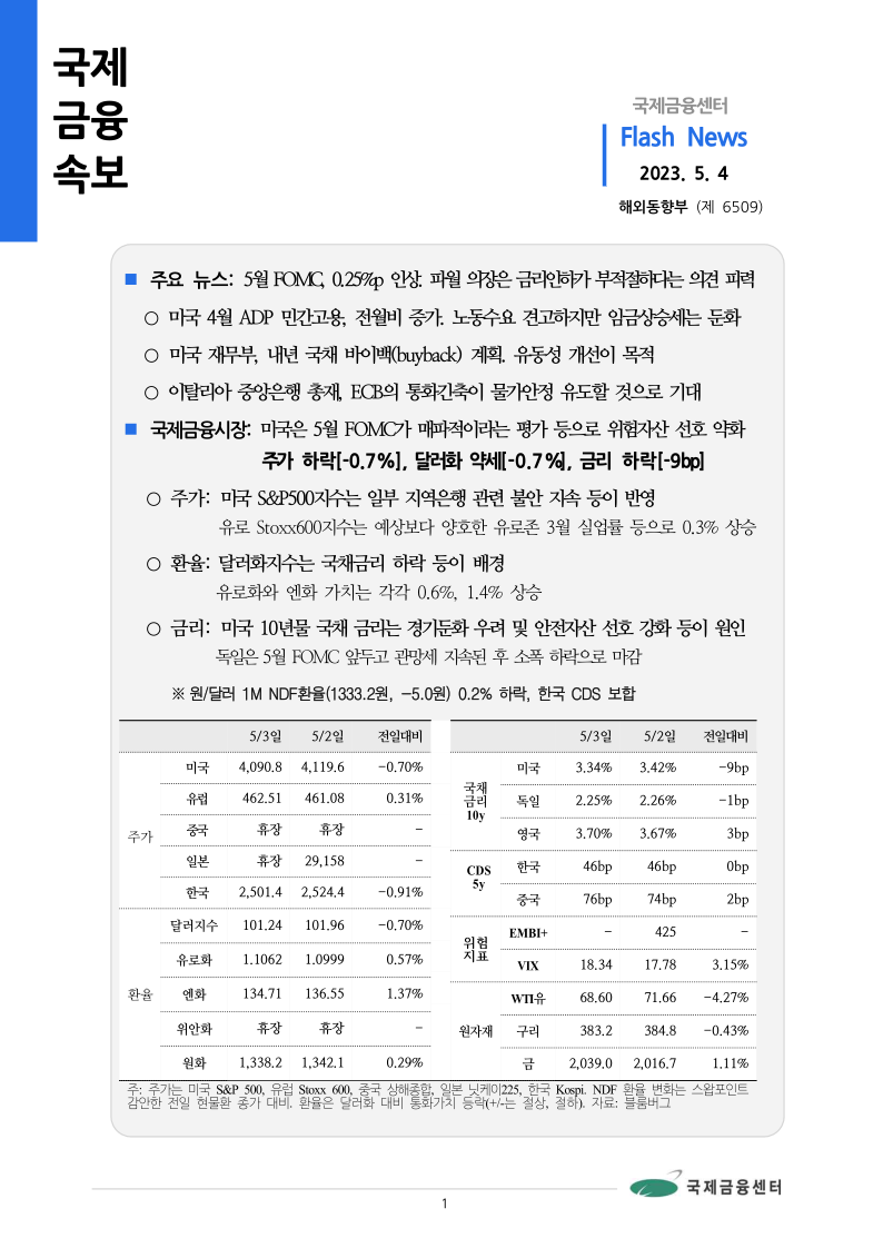 ○ 주가: 미국 S&P500지수는 일부 지역은행 관련 불안 지속 등이 반영