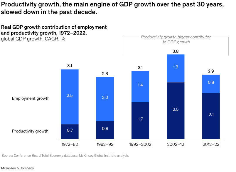 고용 감소는 그러한 장애물 중 하나입니다. 전 세계 총 근로자 수의 연평균 성장률은 1972~82년 2.5%에서 2012~22년 0.8%로 둔화되었는데, 이는 주로 고령화 때문이었습니다. 많은 대규모 국가에서 노동력의 규모는 이미 감소하고 있습니다.8투입물 대비 생산량을 측정하는 생산성, 즉 생산된 상품 및 서비스의 가치를 노동, 자본 및 기타 자원의 양으로 나눈 값은 1992년부터 2022년까지 30년 동안 경제 성장의 주요 원동력이었습니다. 전시 14). 그러나 그 이후로 생산성 증가는 고용 증가 둔화와 함께 둔화되어 경제학자와 정책 입안자들을 혼란스럽게 만들었습니다.9