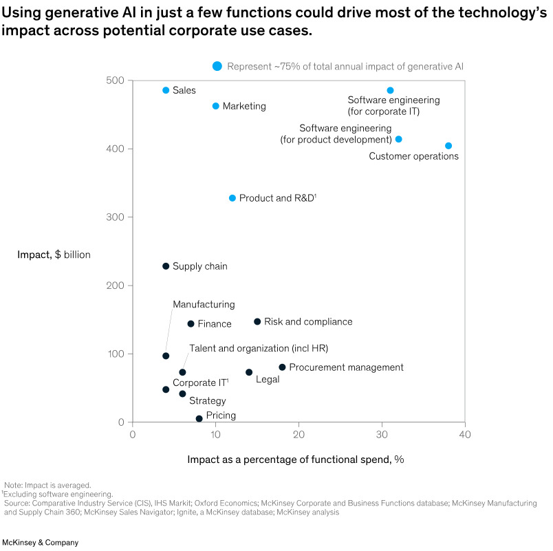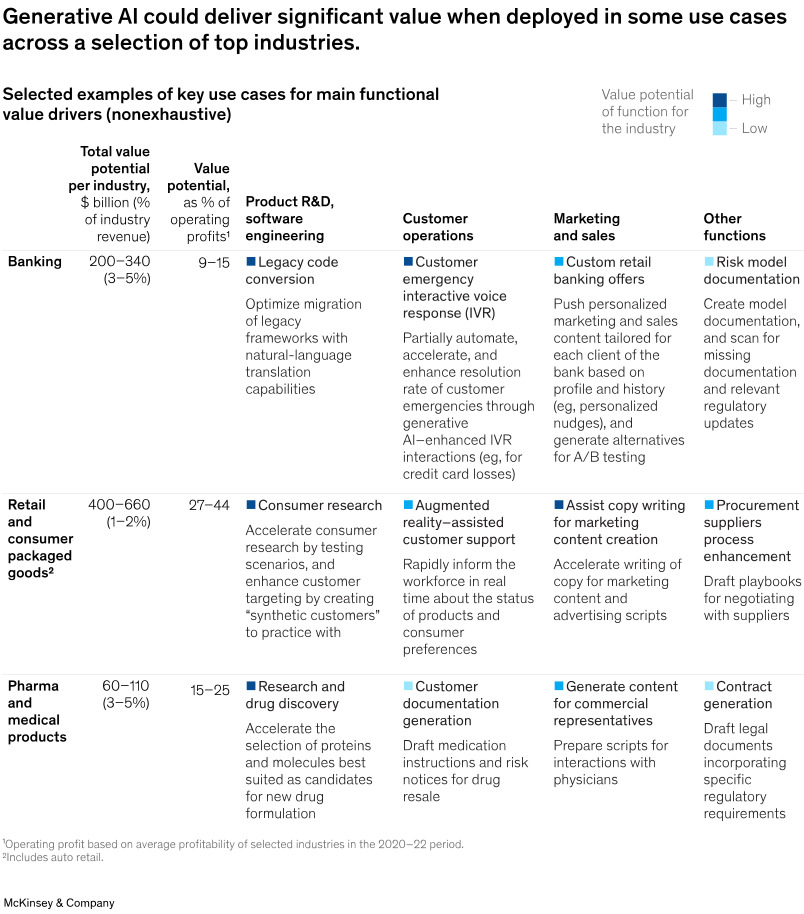 생성적 AI 사용 사례가 제공할 수 있는 가치의 약 75%는 고객 운영, 마케팅 및 영업, 소프트웨어 엔지니어링 및 R&D의 네 가지 영역에 걸쳐 있습니다. 16개의 비즈니스 기능에 걸쳐 기술이 하나 이상의 측정 가능한 결과를 생성하는 방식으로 특정 비즈니스 문제를 해결할 수 있는 63개의 사용 사례를 조사했습니다. 예를 들어 고객과의 상호 작용을 지원하고, 마케팅 및 판매를 위한 창의적인 콘텐츠를 생성하고, 자연어 프롬프트를 기반으로 컴퓨터 코드 초안을 작성하는 생성 AI의 기능 등이 있습니다.