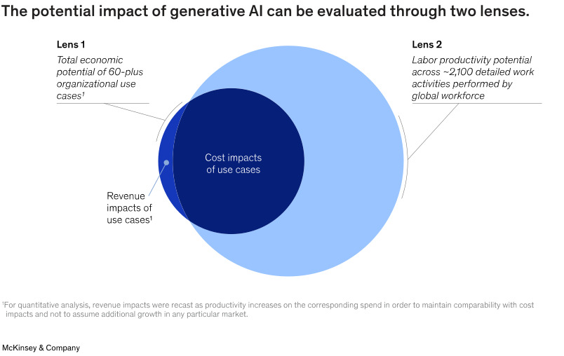 Generative AI is a step change in the evolution of artificial intelligence. As companies rush to adapt and implement it, understanding the technology’s potential to deliver value to the economy and society at large will help shape critical decisions. We have used two complementary lenses to determine where generative AI, with its current capabilities, could deliver the biggest value and how big that value could be (Exhibit 1).