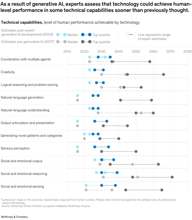 이전에 모델링한 채택 시나리오는 2016년 작업 활동에 소요되는 시간의 50%가 2035년에서 2070년 사이에 자동화될 것이라고 제안했으며 중간 시나리오는 2053년경입니다. 생성 AI의 개발을 설명하는 업데이트된 채택 시나리오는 다음 작업에 소요되는 시간을 모델링합니다. 2023년 작업 활동은 2030년에서 2060년 사이에 50% 자동화에 도달하며 중간점은 2045년입니다. 이는 이전 추정치에 비해 약 10년 가속화된 것입니다.5