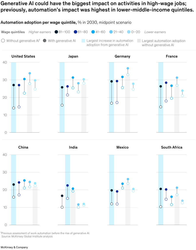 그러나 생성적 AI의 영향은 이전에 상대적으로 자동화의 영향을 받지 않는 것으로 간주되었던 작업의 기술적 자동화 잠재력의 발전으로 인해 고임금 지식 노동자의 업무를 가장 많이 변화시킬 가능성이 높습니다(도표 13).
