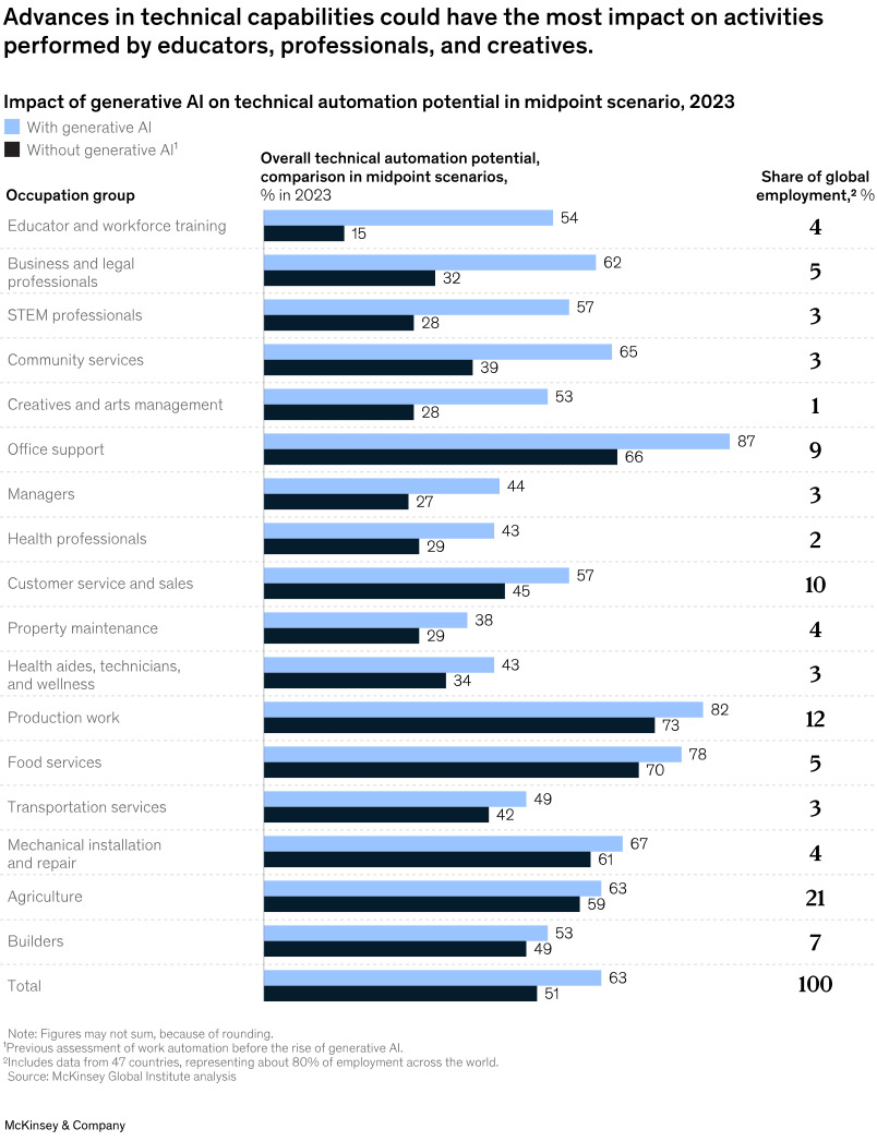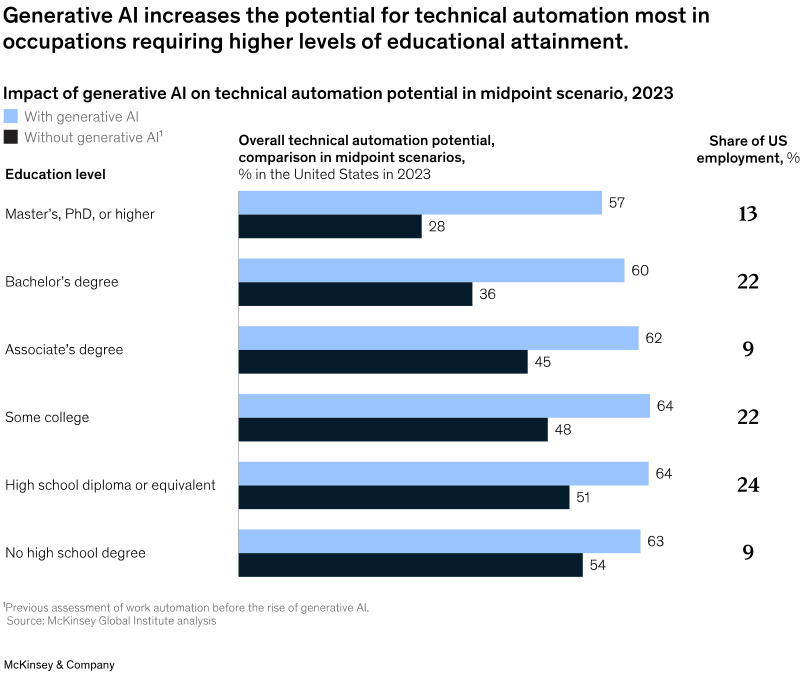 제너레이티브 AI는 개별 활동의 일부를 자동화하여 개별 작업자의 역량을 강화하여 작업의 해부 구조를 변경할 수 있는 잠재력을 가지고 있습니다. 현재의 생성 AI 및 기타 기술은 오늘날 직원 시간의 60~70%를 차지하는 작업 활동을 자동화할 수 있는 잠재력을 가지고 있습니다. 대조적으로 우리는 이전에 기술이 직원들이 일하는 시간의 절반을 자동화할 수 있는 잠재력을 가지고 있다고 추정했습니다. 기술 자동화의 잠재력이 가속화되는 것은 주로 총 작업 시간의 25%를 차지하는 업무 활동에 필요한 자연어 이해 능력이 제너레이티브 AI의 향상에 기인한다. 따라서 생성적 AI는 다른 유형의 작업보다 임금 및 교육 요구 사항이 높은 직업과 관련된 지식 작업에 더 많은 영향을 미칩니다.