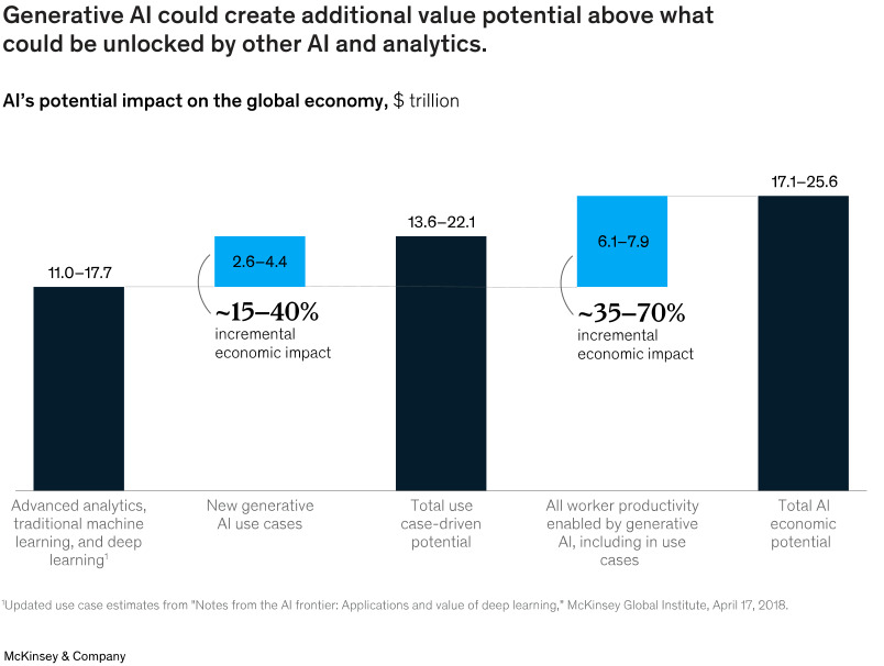 That would add 15 to 40 percent to the $11 trillion to $17.7 trillion of economic value that we now estimate nongenerative artificial intelligence and analytics could unlock. (Our previous estimate from 2017 was that AI could deliver $9.5 trillion to $15.4 trillion in economic value.)