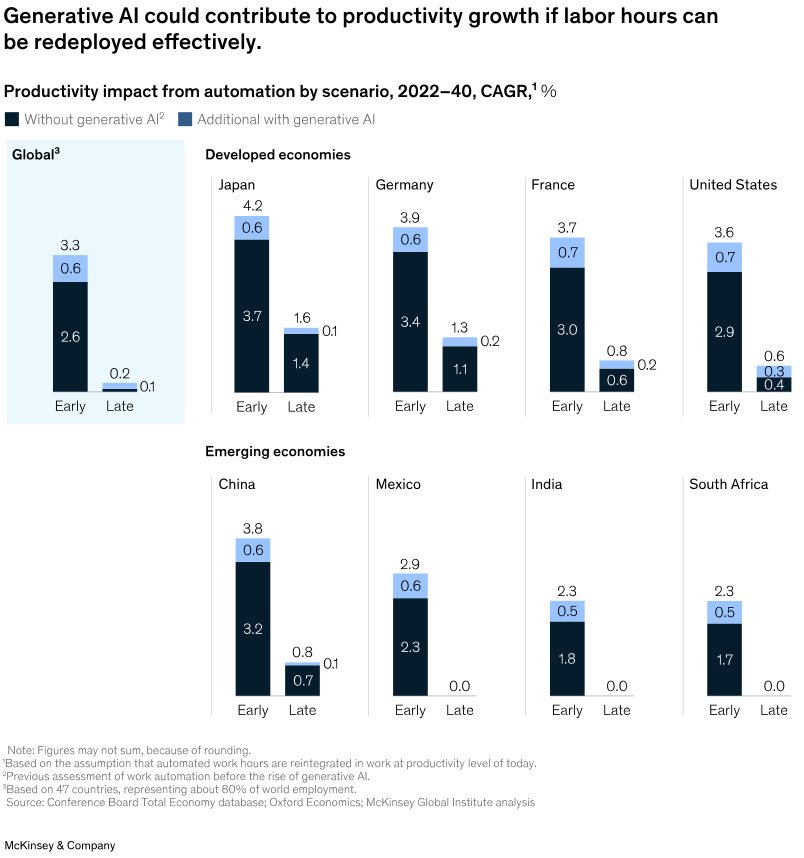 Generative AI can substantially increase labor productivity across the economy, but that will require investments to support workers as they shift work activities or change jobs. Generative AI could enable labor productivity growth of 0.1 to 0.6 percent annually through 2040, depending on the rate of technology adoption and redeployment of worker time into other activities. Combining generative AI with all other technologies, work automation could add 0.2 to 3.3 percentage points annually to productivity growth. However, workers will need support in learning new skills, and some will change occupations. If worker transitions and other risks can be managed, generative AI could contribute substantively to economic growth and support a more sustainable, inclusive world.