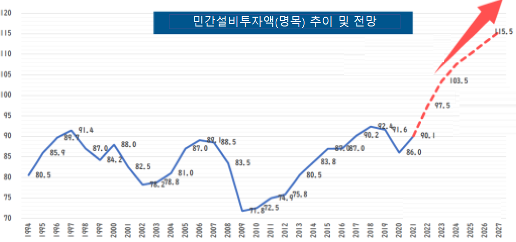 일본 정부는 GX, DX, 생성AI 분야에 대한 지속적인 투자를 통해 민간기업 설비투자액을 2027년도 115조 엔(2022년도 97조5000억 엔)까지 확대하고 소득 향상이라는 선순환을 만들고자 한다.