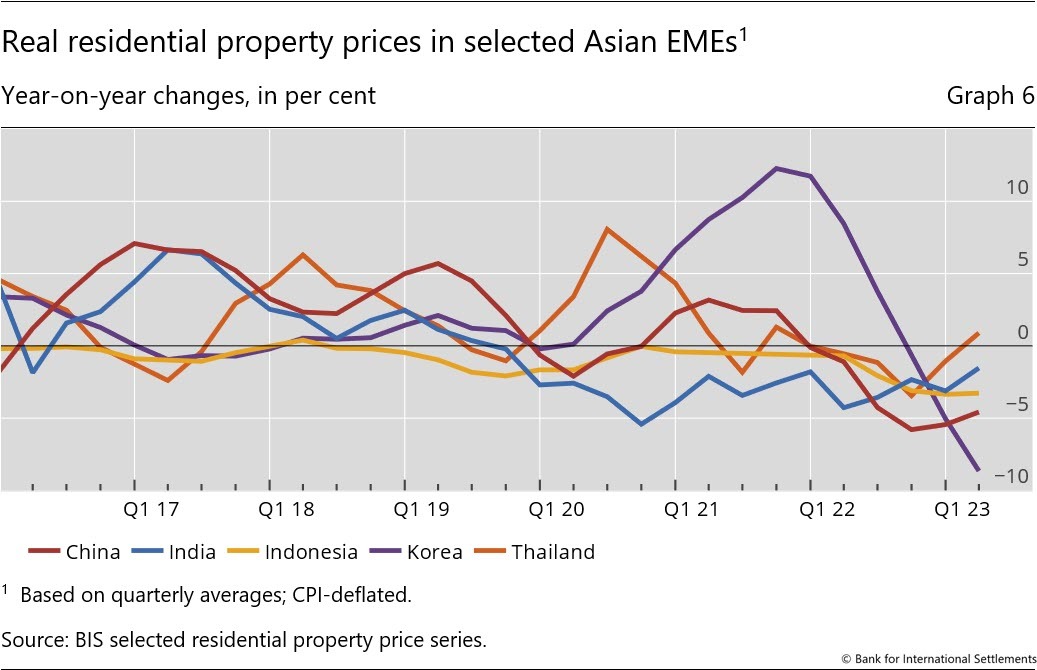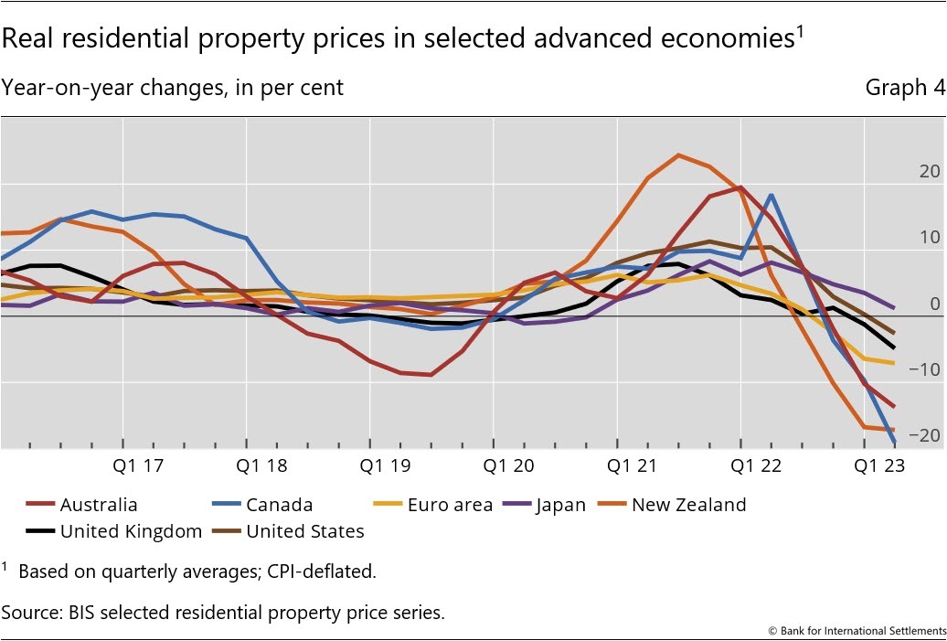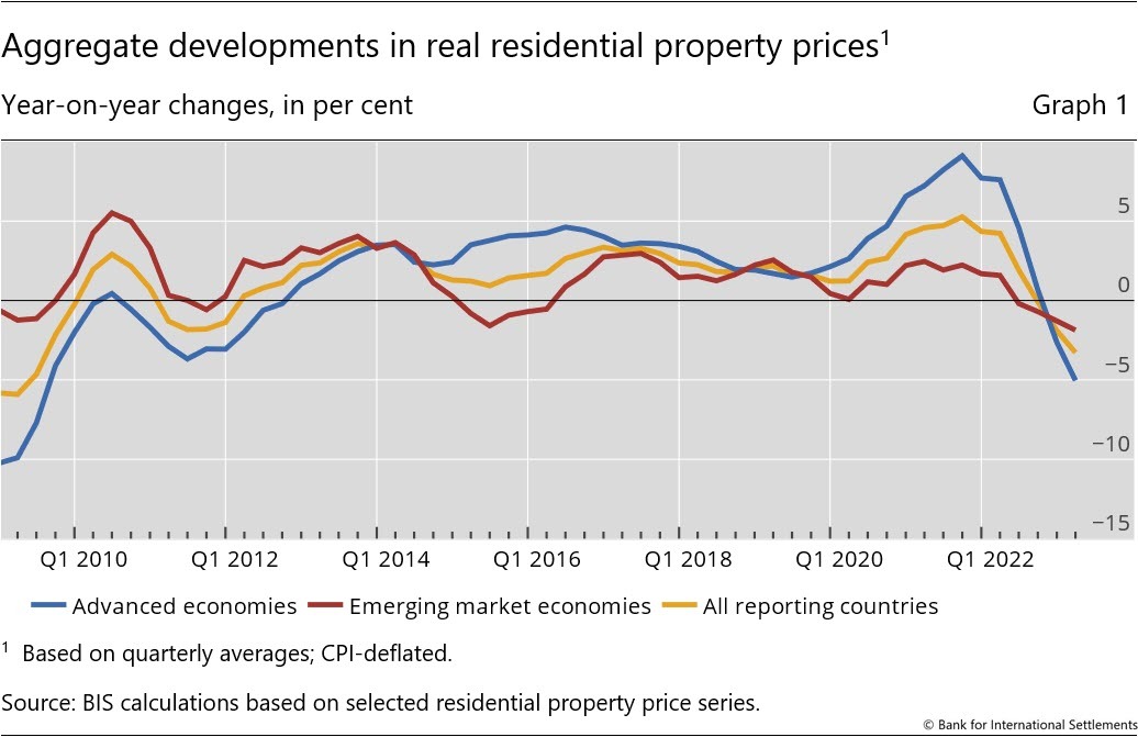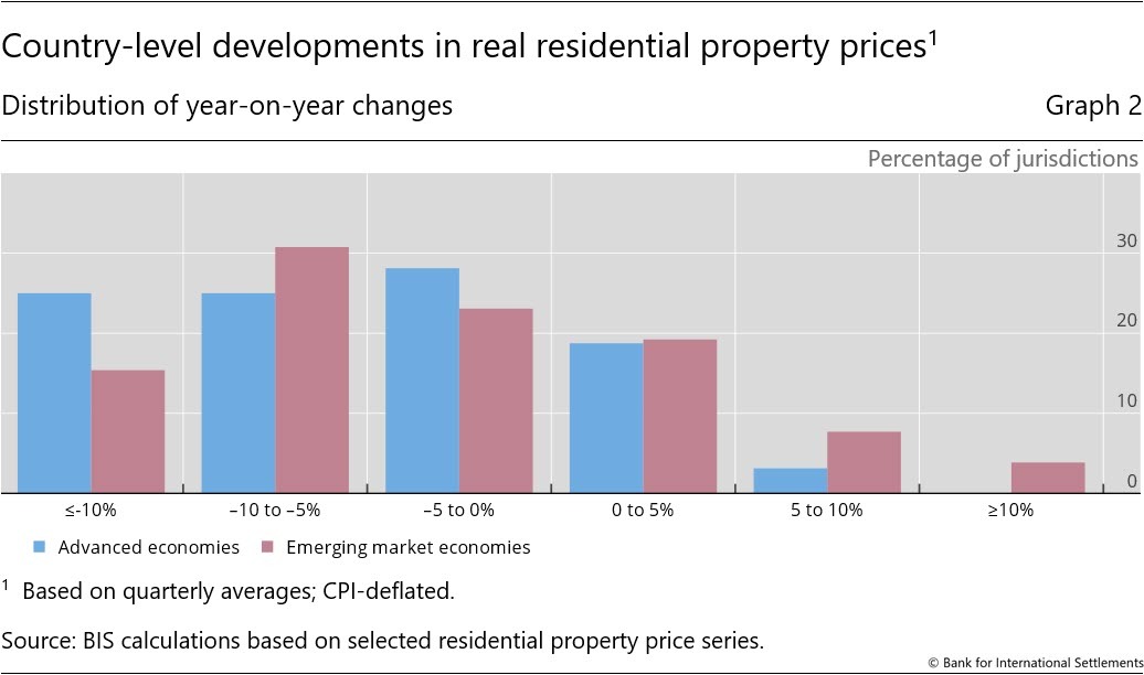 - 실질 주택 가격 하락은 특히 선진국(AE)에서 두드러졌습니다(-5.0% yoy). 신흥시장경제(EME)에서는 가격이 완만하게 하락했습니다(-1.9%).