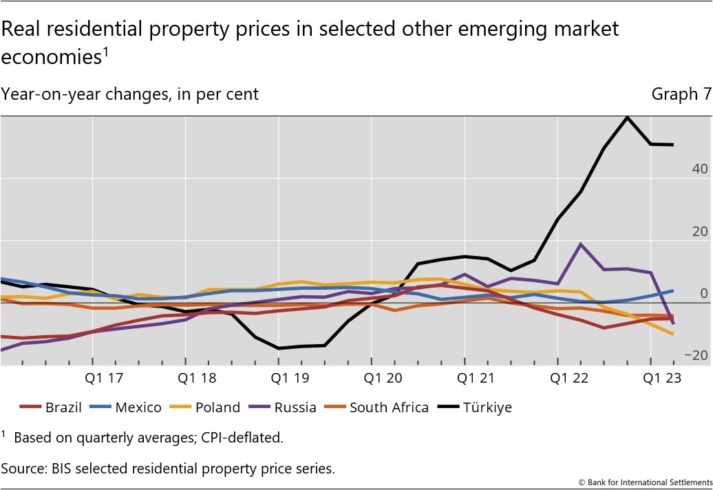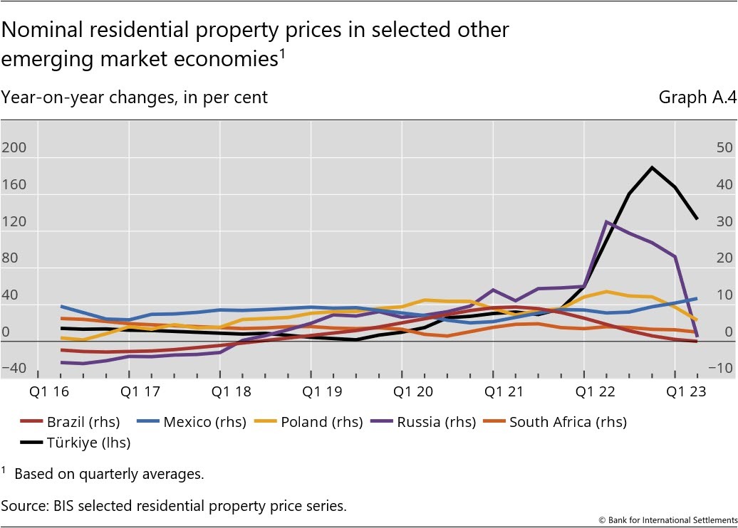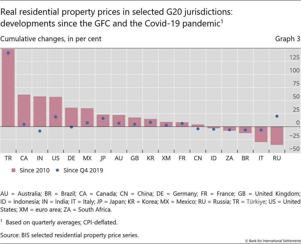 - 주요 경제권에서는 중요한 차이점이 남아 있습니다. 예를 들어, 투르키예에서는 실질 주택 가격이 급등했지만 일본에서는 변동이 없었고 호주와 독일에서는 급락했으며 캐나다에서는 더욱 하락했습니다.
