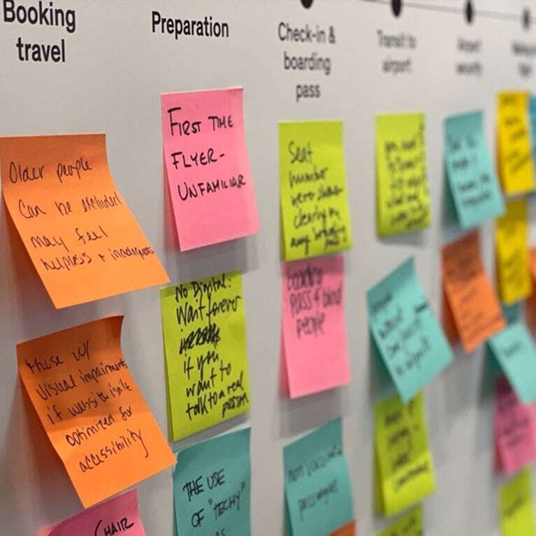 첫 번째 단계로, 참가자들은 여행에 대한 생각에서 그 여행을위한 항공편 예약, 공항으로가는 여행, 보안을 통해 엔드 투 엔드 여행 여행 —을 매핑했습니다, 비행기 탑승 및 그 이상.