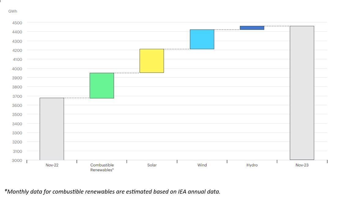 | 한국: 2023년 11월 절대 y-o-y 신재생 전력 생산량 변동 |