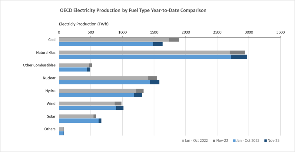 | 2023년 11월 데이터를 포함한 IEA의 최신 월간 전력 통계 보고서에 따르면 다음과 같습니다. OECD의 경우 2023년 11월 총 순 전력 생산량은 862.0TWh로 2022년 11월 대비 1.6% 증가했습니다. 화석연료 공급원의 전력생산은 지속적으로 감소하였는데, 이는 석탄화력발전소의 생산 감소(-8.8% yo-y)의 영향이 컸습니다. 구체적으로는 미국(-8.7% yo-y), 독일(-26.7% yo-y), 폴란드(-18.7% yo-y), 일본(-7.7% yo-y), 튀르키예공화국(-10.7%) 등의 생산 감소가 전체적인 석탄화력발전 감소 추세를 견인했습니다. 반대로, 풍력(+5.1% y-o-y)과 태양광(+10.9%)의 생산 증가에 힘입어 2023년 7월부터 지속된 추세인 재생에너지 순전력 생산량은 전년 동기(+6.0% y-y)보다 높은 수준을 유지했습니다. OECD 유럽의 경우, 수력 발전이 2022년보다 더 습한 늦여름과 가을을 경험했기 때문에 전력 믹스의 재생 에너지 증가(+32.9%)에 큰 기여를 했습니다. 프랑스의 생산량이 2022년의 낮은 수준(+27.7% yo-y)에서 반등했지만 2021년 수준에는 미치지 못했기 때문에 원자력 발전의 전력 생산은 전년 대비 6.0% 증가했습니다. OECD 아시아 오세아니아에서도 일본과 한국은 2022년 대비 원전 발전량이 큰 폭(+45.1%, 전년 대비 각각 12.2%)으로 나타났습니다. |