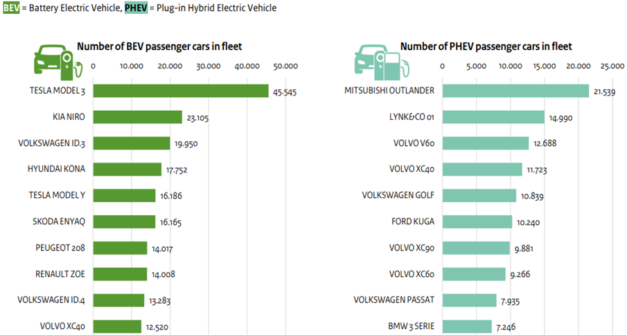 네덜란드교통국(RDW) 통계에 따르면, 2009년 12월 31일에 등록된 전기차는 146대에 불과했지만 그 이후 2023년 9월 30일까지 등록된 순수 전기자동차는 테슬라 모델3이 4만5545대로 가장 많고 그 다음은 기아의 니로, 폴크스바겐의 ID.3과 현대의 코나가 각각 2만3105대, 1만9950대와 1만7752대를 기록했다.