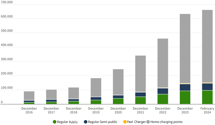 이 정책에 기초해 2024년 2월 기준 공공 완속 충전기와 세미-공공 완속 충전기를 합친 완속 충전기는 14만5332대이며 급속 충전기는 4421대이다. 또한, 각 가정이 개인용으로 설치한 가정용 충전기는 51만285대로 추정하고 있다. 참고로 네덜란드에서는 24시간 접근이 가능한 곳에 설치된 충전기를 ‘공공 완속 충전기(Regular Public)’, 백화점·쇼핑몰·극장처럼 영업시간 종료 후에 접근이 제한된 곳에 소재한 충전기를 세미-공공 완속 충전기(Regular Semi-public), 전기자동차 배터리에 직류 전원을 공급해 고속 충전이 가능한 충전기를 ‘급속 충전기(Fast Charger)’라고 명칭한다.