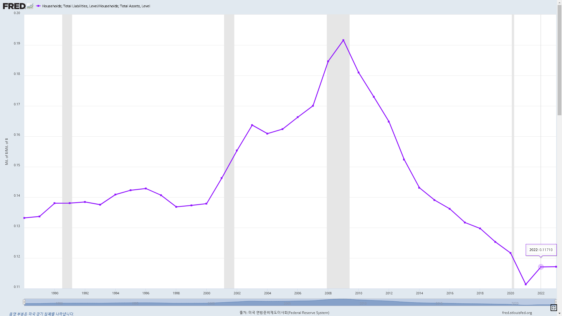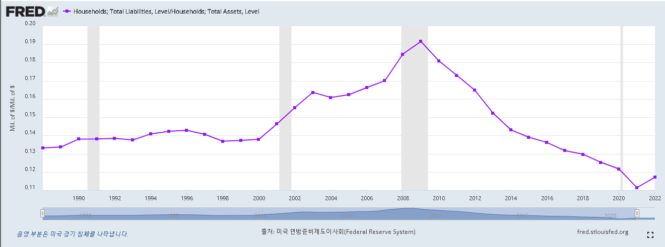 연방준비제도 이사회의 자료는 자산 대비 가계부채 비율의 최근 변화를 보여줍니다. Yu-Ting Chiang과 Mick Dueholm의 연구는 젊은 연령층이 나이가 많은 연령층보다 부채가 어떻게 더 빠르게 증가했는지 연구합니다.
