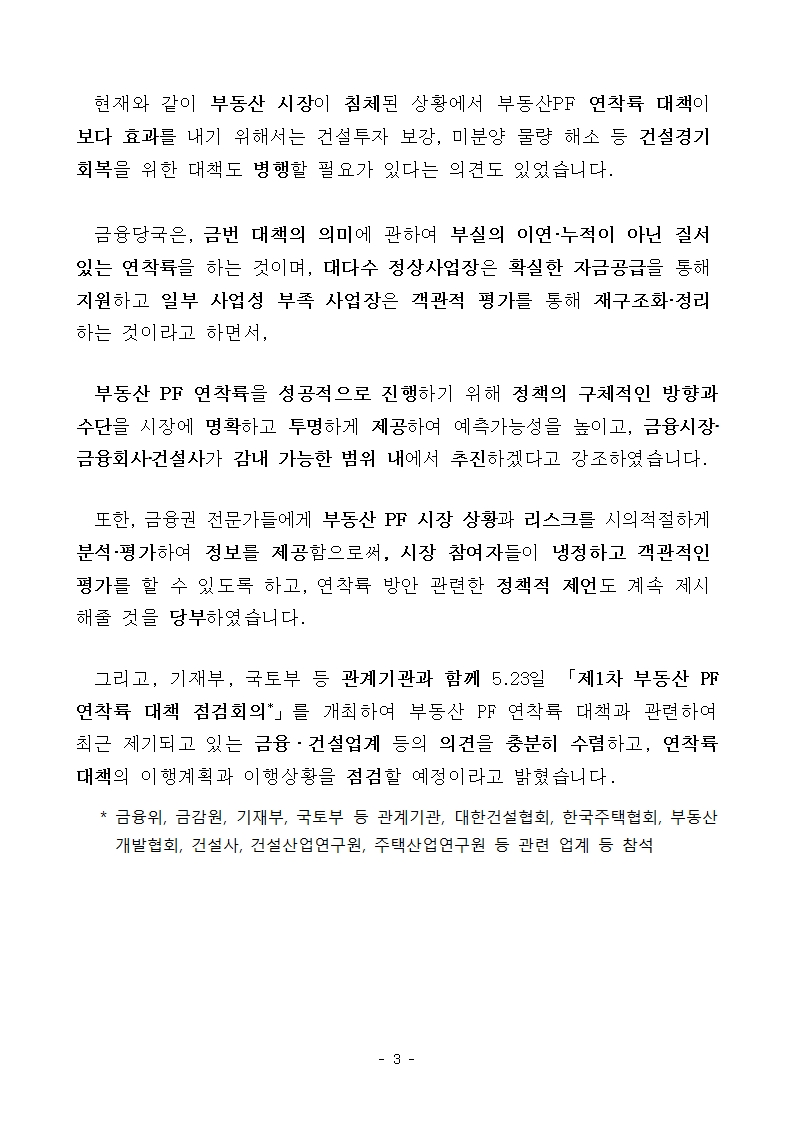 ◈ 금융당국, 5.23일(목) 「제1차 부동산 PF 연착륙 대책 점검회의」를 개최하여 기재부, 국토부 등 관계기관과 함께 금융,건설업계 등의 의견을 충분히 수렴하고, 연착륙 대책의 이행계획과 이행상황을 점검할 예정