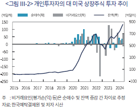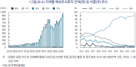 2024년 8월 말 기준 개인투자자의 지역별 해외주식 보관 잔액은 대미국 투자 비중이 압도적으로 높은 것으로 나타난다. <그림 Ⅲ-1>에 나타난 바와 같이 개인투자자의 미국 주식(ETF 포함) 보관 잔액은 약 890억달러로 전체 보관 잔액의 90% 수준에 해당한다. 개인투자자의 미국 주식투자는 2016년 이후 빠른 증가세를 보이고 있다. 개인투자자의 총 해외주식투자 잔액 대비 미국 상장주식 보유 비중은 2016년 말 약 30% 수준에 불과했으나 2020년 말 이후 지속해서 80% 수준을 상회하고 있다. 이는 최근 미국 빅테크 기업의 주가 상승세 및 미연준의 통화정책 기조 변화에 대한 기대 등을 기반으로 해당 지역에 대한 투자 비중이 크게 상승하고 있는 것으로 나타난다. 반면 개인투자자의 유럽, 중국, 일본 등 기타 지역에 대한 투자 비중은 상대적인 하락세를 보이고 있다. 특히 2016년까지 개인투자자의 투자 비중이 높은 수준을 기록하였던 중국(홍콩 포함)에 대한 투자 비중은 2024년 2분기 기준 2.6% 수준까지 하락한 것으로 나타난다.