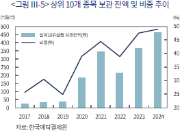 개인투자자의 해외주식 직접투자는 특히 일부 종목에 대한 집중도가 매우 높은 수준으로 파악된다. <그림 Ⅲ-5>에 나타난 바와 같이 2024년 6월말 기준 상위 10개 종목(보관잔액 기준) 보유 비중은 개인투자자 전체 보관잔액의 약 절반을 차지한다. 특히 상위 1위 및 2위 종목인 엔비디아와 테슬라 주식 보유 비중은 2024년 6월 말 기준 약 26% 수준으로 개인투자자의 소수 종목에 대한 집중도가 매우 높은 수준임을 알 수 있다. 이러한 개인투자자의 일부 종목에 대한 과도한 편중 현상은 최근 더욱 심화되고 있는 것으로 나타난다. 개인투자자의 전체 해외주식 포트폴리오에서 상위 10개 종목이 차지하는 비중은 2017년 말 약 25% 수준이었으나, 해외주식투자 급상승세가 나타나기 시작한 2020년 이후에는 지속해서 40% 수준을 상회하고 있는 것으로 나타난다.