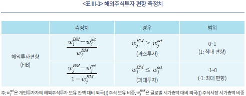 한편 개인투자자의 지역별 자산배분 현황을 이론적 최적 자산배분과의 괴리로 측정한 편향도 기준으로 살펴보면 개인투자자는 지역별로 상이한 편향을 보이고 있는 것으로 나타난다.20) 본고의 해외주식투자 편향도는 지역별 실제 보유비중과 자산가격결정이론(CAPM)과의 괴리로 측정하였으며, 각국별 최대 모국투자 및 해외투자 편향 최대치 대비 비중으로 정규화하여 각국 주식시장 규모에 따른 측정치의 편중 현상을 최소화하였다. <표 Ⅲ-1>은 본고에서 사용한 해외주식투자 편향 측정치의 범위 및 측정 방법 등을 정리하였다.