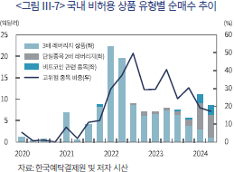 특히 개인투자자의 고위험 상품 투자 비중 확대 추세는 레버리지 파생상품에 대한 소비자 보호가 강화된 2020년 하반기 이후 나타나고 있다는 점에서 유의할 필요가 있다. 앞서 서술한 바와 같이 정부는 2020년 7월 국내 레버리지 파생상품 투자 시 예탁금 및 사전교육 이수 등을 의무화하는 규제 강화 방안을 실시한 바 있다. 이러한 국내 상품에 대한 규제 강화가 해당 규제가 적용되지 않는 해외상품 투자 확대를 초래하고 있는 것이다. <그림 Ⅲ-7>에 나타난 바와 같이 개인투자자의 고위험 상품 투자는 국내법상 허용되지 않는 고배율 레버리지 상품 중심으로 확대되고 있는 것으로 나타난다. 특히 최근에는 비트코인 관련 상품 및 단일종목 레버리지 상품 등에 대한 순매수가 빠르게 증가하고 있다.23) 2024년 8월 말 기준 개인투자자의 비트코인 관련 2배 레버리지 상품(Volaltiry Shares ‘2X Bitcoin Strategy ETF’) 보관잔액은 약 3억달러 수준으로 이는 해당 상품 시가총액의 18%에 달하는 것으로 나타난다.24)