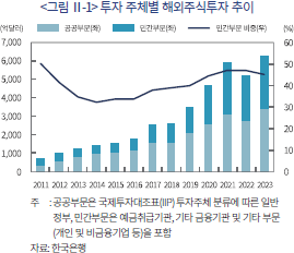 우리나라 투자자의 2023년 말 기준 해외주식투자 잔액은 약 6,228억달러 수준으로 2011년 말 대비 약 9배 증가한 것으로 나타난다. 국내 해외주식투자 주체를 공공 및 민간 부문으로 나누어 보면, 2020년을 기준으로 이전 시점에서는 공공부문이 해외주식투자 성장세를 주도한 반면 이후 시점에서는 민간부문 해외주식투자가 빠르게 확대되는 모습을 보이고 있다.1) 2023년 말 기준 공공부문의 해외주식투자 잔액 비중은 약 55% 수준으로 2013~2019년 기간 대비 소폭 하락한 것으로 나타나나 잔액 기준으로는 지속적인 성장세를 기록하고 있다. 공공부문의 지속적인 해외주식투자 확대 추세는 국민연금기금의 높은 해외주식투자 비중에 기인한다. 2023년 말 기준 국민연금기금은 전체 자산의 약 31%를 해외주식에 투자하고 있으며, 이는 공공부문 해외주식투자 잔액의 약 70%, 우리나라 전체 해외주식투자 규모의 약 39%에 해당한다.