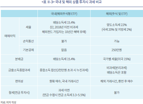 조세 측면에서도 투자상품의 국내 또는 해외시장 상장 여부에 따라 차이가 발생한다. 매매차익의 경우에는 해외주식 직접거래 시 국내 출시 해외주식형 펀드 상품 대비 높은 세율이 적용된다. 국내 법상 펀드에 대해서는 배당소득세(15.4%)가 과세되는 반면 장외증권에 해당하는 해외주식에 대해서는 양도소득세(22%)가 부과되기 때문이다.16) 다만 양도소득세의 경우 매매차익에 대한 기본공제(250만원) 혜택이 부여되며 보유한 상품의 손익을 통합하여 과세하는 손익통산이 적용되고 있어 투자수익 규모에 따라 과세부담은 변동될 수 있다.17) 또한 해외주식 매매차익은 금융소득종합과세 대상에서 제외되는 데 반해 국내 상품의 경우에는 매매차익 2천만원 이상인 경우 금융소득종합과세 대상에 포함된다. 반면 국내 상품의 경우에는 ISA 등 연금계좌를 통한 절세가 가능하나 해외상품은 이에 해당하지 않는다.