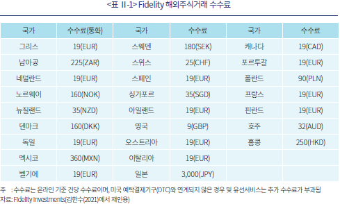 이러한 상황임에도 불구하고 우리나라의 경우 해외주식 직접거래 수수료는 주요국 대비 낮은 수준이다. 현재 국내 주요 증권사의 해외주식 거래수수료는 7~25bp 수준으로 국내 주식거래 수수료(1~20bp) 대비 높은 수준이기는 하나 국경간 거래의 복잡한 거래구조 등을 고려할 때 낮은 수준으로 판단된다.8) 특히 해외시장에서의 국경간 주식거래 수수료와 비교할 때 국내 투자중개업자를 통한 해외주식 거래 수수료는 매우 낮은 수준임을 알 수 있다. <표 Ⅱ-1>에 나타난 바와 같이 미국 주요 증권사의 경우 해외주식 온라인 거래에는 거래 건당 높은 수수료를 부과하고 있으며 거래 가능 국가 또한 국내 투자중개업자 대비 제한적인 수준이다.9)