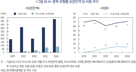 국내 개인투자자의 종목별 해외주식 자산배분 현황을 살펴보면 최근 미국 대형 기술주에 대한 집중도가 빠르게 상승하고 있다. 개인투자자의 투자 비중 상위 50개 종목 중 미국 기술주가 차지하는 비중은 2024년 6월 말 기준 약 71%의 높은 수준을 기록하고 있다. 개인투자자의 기술주 선호 현상은 해외주식투자 급성장 추세가 시작된 2020년 시점부터 나타나고 있다. <그림 Ⅲ-6>에서 볼 수 있듯이 개인투자자의 미국 기술주에 대한 투자 잔액 및 비중은 2020년 이후 지속해서 높은 수준을 기록하고 있으며, 이는 최근 개인투자자의 해외주식투자 확대가 일부 지역 및 종목에 대한 집중 심화와 함께 나타나고 있음을 보여주고 있다.