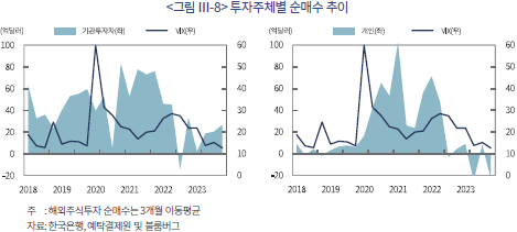 25) 한국은행(2024)의 회귀분석 결과에 따르면 국제금융성 변동성 지수(VIX)의 개인 및 기관투자자의 해외증권 순투자에 대한 계수는 각각 유의한 양의값(4.19) 및 음의값(-16.58)으로 추정되었다.