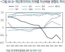 아래 <그림 Ⅲ-3>은 개인투자자의 투자 비중 상위 7개 국가에 대한 지역별 편향도 추이를 보여주고 있다. 개인투자자의 지역별 자산배분에 대한 편향은 2023년 말 기준 대부분의 지역에 대해 과소 편향을 보이고 있는 반면 최근 해외주식투자 비중이 크게 증가하고 있는 미국 지역에 대해서는 높은 수준의 과대투자 편향(-0.8)으로 측정된다.21) 특히 미국 지역에 대한 개인투자자의 편향도는 2011년 중 높은 수준의 과소 투자편향(0.7)을 기록하였으나, 2020년 이후 과대편향으로 반전된 것으로 나타난다. 한편 개인투자자의 유럽 지역에 대한 투자편향은 지속해서 높은 수준의 과소투자 편향을 보이고 있으며, 베트남 및 일본 지역에 대한 편향도는 여타 지역 대비 낮은 수준으로 파악된다.