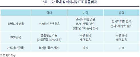 한편 해외주식 관련 고위험 상품의 출시 및 거래와 관련해서는 국내 및 해외시장 상품간 제도적 차이가 존재한다. 국내법이 적용되지 않는 해외상품과는 달리 국내 증권거래소에 상장된 해외주식 관련 상품에 대해서는 다양한 규제가 적용되기 때문이다. 즉, 해외주식을 기초자산으로 하는 국내 출시 상품의 경우 국내 금융투자업 규정에 따라 종목의 구성 및 레버리지 배율 제한 등의 규정이 적용된다.13) 이에 따라 현재 국내에서는 해외주식 ETF 상품의 경우 레버리지 배율 2배 이내 상품만이 출시 가능하며, 단일종목 ETF의 경우에도 30% 비중 제한 규정 등에 따라 채권 등과 10개 이상의 기초자산으로 구성된 혼합형 상품만이 출시되어 있다.14) 이러한 국내ㆍ외 제도적 차이로 인해 최근 개인투자자의 투자가 크게 증가하고 있는 고배율 레버리지 상품 투자는 해외시장을 통한 직접거래만이 유일한 방안이다. 현재 해외시장에서는 <표 Ⅱ-2>에 나타난 바와 같이 다양한 고위험 상품이 출시되어 있는 상황으로 특히 유럽의 경우 최고 5배 레버리지 상품까지 출시된 것으로 나타나고 있다.