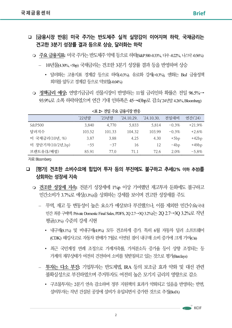 ㅁ [금융시장 반응] 미국 주가는 반도체주 실적 실망감이 이어지며 하락, 국채금리는 견고한 3분기