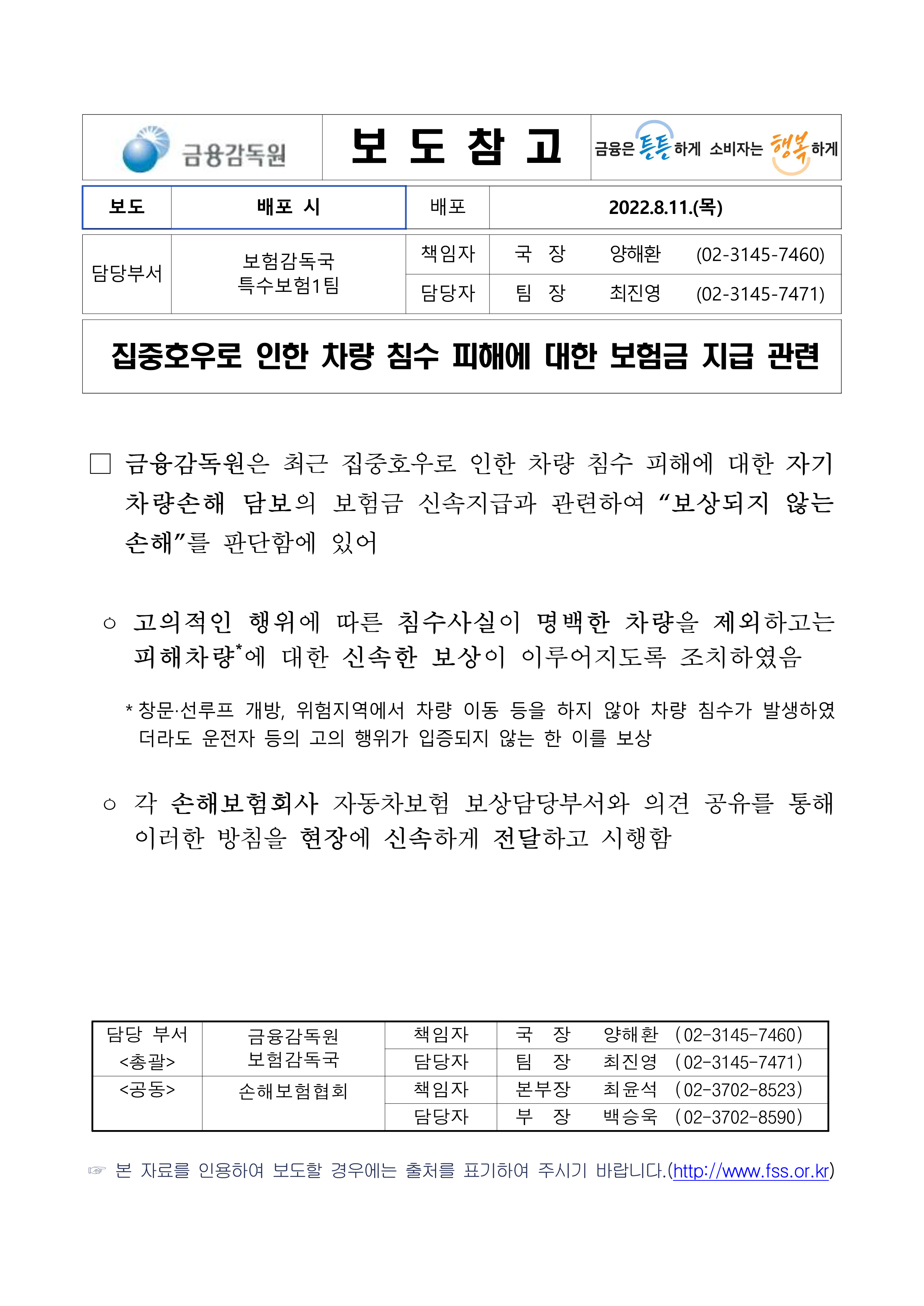220811 (보도참고) 집중호우로 인한 차량 침수 피해에 대한 보험금 지급 관련.pdf (파일크기: 157KB)