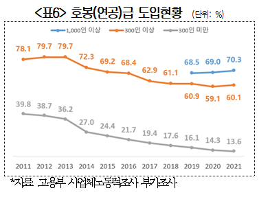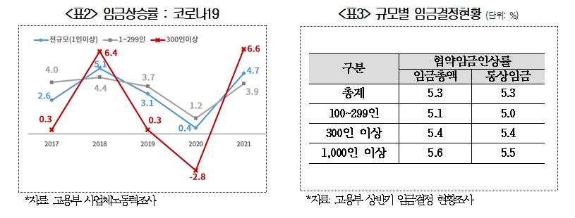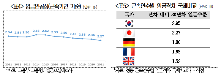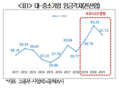 | 코로나 이후 대 - 중기 임금격차 다시 벌어져 ... 직무급제로 개편 필요 - 코로나 19 영향으로 줄어들던 대 - 중소기업간 임금격차 다시 확대 조짐 ... 대기업 임금상승률이 코로나 19 로 – 2.8% 까지 떨어졌다가 6.6% 급상 등 - 세대간 임금격차 감소 추세이나 여전히 격차 커 ... 근속 10 년차 임금 신입 대비 2.3 배 - 한국형 O*NET 구축방안 : ① 조사대상 사업체 확대 ②NCS와 통합 ③ 민간역할 확대 The Occupational information Network 국가직무능력표준 최근 정부가 노동시장 개혁 우선 추진과제로 발표한 직무 중심 임금체계 개편을 추진하기 위해서는 직업별 시장임금수준과 직무정보를 제공하는 통합적 시스템이 조속히 구축되어야 한다는 주장이 나왔다 . 대한상공회의소 ( 회장 최태원 ) 는 31 일 발표한 ‘ 코로나 19 이후 임금격차 진단과 개선방안 연구 ’ 보고서를 통해 “ 코로나 19 영향으로 줄어들던 대 - 중소기업간 임금격차가 지난해 대기업 중심으로 임금상승률이 회복되면서 다시 확대되고 있다 ” 며 “ 기업간 · 세대간 임금격차를 해소하고 지속가능한 임금체계로의 전환을 뒷받침할 수 있도록 시장임금정보 제공체계를 조속히 구축해야 한다 ” 고 밝혔다 . 보고서에 따르면 기업규모별 임금격차를 나타내는 300 인 이상 대기업의 임금 대비 300 인 미만 중소기업의 임금수준을 분석한결과 , 지난 10 년간 대기업 대비 중소기업 임금수준은 60% 미만을 유지하다 코로나를 겪으면서 60% 이상으로 좁혀졌다 . 그러나 최근 일상회복이 되면서 대중소기업간 임금격차가 다시 확대되는 조짐을 보이고 있다 . 실제로 대기업 임금상승률은 코로나 19 직전인 2018 년 6.4% 에서 2019 년 0.3%, 2020 년 – 2.8% 로 크게 떨어졌지만 2021 년 6.6% 로 가파르게 상승했다 . 반면 중소기업의 경우 2018 년 4.4% 에서 2019 년 3.7%, 2020 년 1.2% 로 대기업에 비해 다소 낮게 떨어졌지만 2021 년 3.9% 로 이전 상승률을 회복하지 못했다 . 2022 년 상반기 임금결정 현황조사에서도 300 인 이상 기업의 협약임금인상률은 5.4%( 임금총액 기준 ) 로 100~299 인 미만 중소기업 인상률 (5.1%) 을 상회했다 . 가장 높은 인상률을 보인 기업규모는 1,000 인 이상 기업으로 5.6% 인상했다 . 대한상의 관계자는 “ 기업규모별 임금격차 완화는 코로나 19 로 인해 일시적으로 나타난 현상으로 대기업의 임금상승률이 회복되면 격차는 다시 확대될 수밖에 없는 상황이였다 ” 며 “ 최근 대기업과 IT 선도기업 중심으로 큰 폭의 임금인상이 이루어지고 있어 올해 임금격차는 더 벌어질 것 ” 이라고 전망했다 . 세대간 임금격차 감소 추세이나 여전히 격차 커 ... 근속 10 년차 임금 신입 대비 2.3 배 한편 , 세대간 임금격차는 코로나와 무관하게 점진적으로 개선되는 모양이나 주요국과 비교시 큰 차이를 보이고 있다 . 보고서에 따르면 근속기간 1 년차 대비 10 년차 이상 임금수준 ( 임금연공성 ) 은 2014 년 2.63 배로 정점을 찍은 후 낮아지고 있지만 2021 년 2.27 배로 세대간 임금격차가 여전히 높은 것으로 나타났다 . 주요국과 비교시 근속 30 년차 임금연공성은 한국이 2.95 배로 일본 2.27 배 , 독일 1.80 배 , 프랑스 1.63 배 , 영국 1.52 배 등 외국과 비교해도 높은 수준이다 . 세대간 임금격차 개선이 더딘 이유에 대해 보고서는 대기업의 높은 호봉 ( 연공 ) 급 운용을 원인으로 지목했다 . 실제 호봉급을 도입한 대기업 비중은 60.1% 에 달한 반면 , 중소기업은 13.6% 에 불과했다 . 특히 , 1,000 인 이상 대규모 기업의 70.3% 가 호봉급을 도입하고 있었으며 , 오히려 도입률이 높아지고 있는 것으로 나타났다 . 대한상의 관계자는 “ 세대간 임금격차를 완화하기 위해서는 호봉제에서 직무급제로 개편해야 하는데 근로기준법상 노조 동의를 받아야 하기 때문에 임금체계 변경이 현실적으로 어려운 측면이 있다 ” 고 설명했다 . 실제 300 명 이상 사업장의 절반가량인 49.2% 가 노조가 조직되어 있으며 , 전체 조합원의 88.7% 가 이들 사업장에 소속되어 있다 . 한국형 O*NET 구축방안 : ① 조사대상 사업체 확대 ②NCS와 통합 ③ 민간역할 확대 The Occupational information Network 국가직무능력표준 동 보고서는 임금격차 문제가 △ 중소기업 취업기피 △ 청년일자리 문제 △ 중고령인력 고용불안 등 노동시장 부작용을 야기하고 있다고 지적하며 , 연공급 임금체계를 직무급 중심으로 개편하는 것이 시급하다고 주장했다 . 이를 위해 직무급 전환시 근로자대표의 동의를 성실한 협의로 전환하는 취업규칙 변경규제 완화와 직업별 시장임금정보 제공을 위한 임금직무정보시스템을 개편해야 한다고 제시했다 . 다만 , 보고서는 “ 취업규칙 변경규제 완화의 경우 근로기준법 개정사항으로 노동계의 반 대에 부딪힐 수 있어 쉽지 않은 만큼 , 먼저 법개정과 무관한 직업별 시장임금정보 제공 시스템 구축에 정책역량을 집중해야 한다 ” 고 밝혔다 . 한편 , 고용노동부도 임금체계 개편을 위해 한국형 직업별 임금정보시스템을 구축하겠다고 발표한 바 있다 . 보고서에 따르면 현재 임금직무정보시스템을 통해 임금정보를 제공하고 있으나 실제 제공되는 직업은 120 개에 불과하며 , 해당 직업의 구체적인 직무정보가 함께 제공되지 않아 기