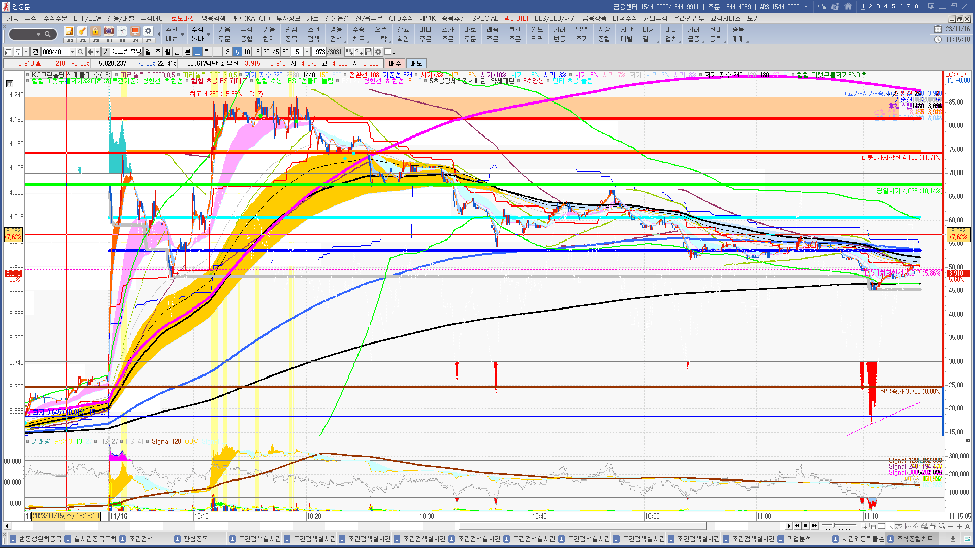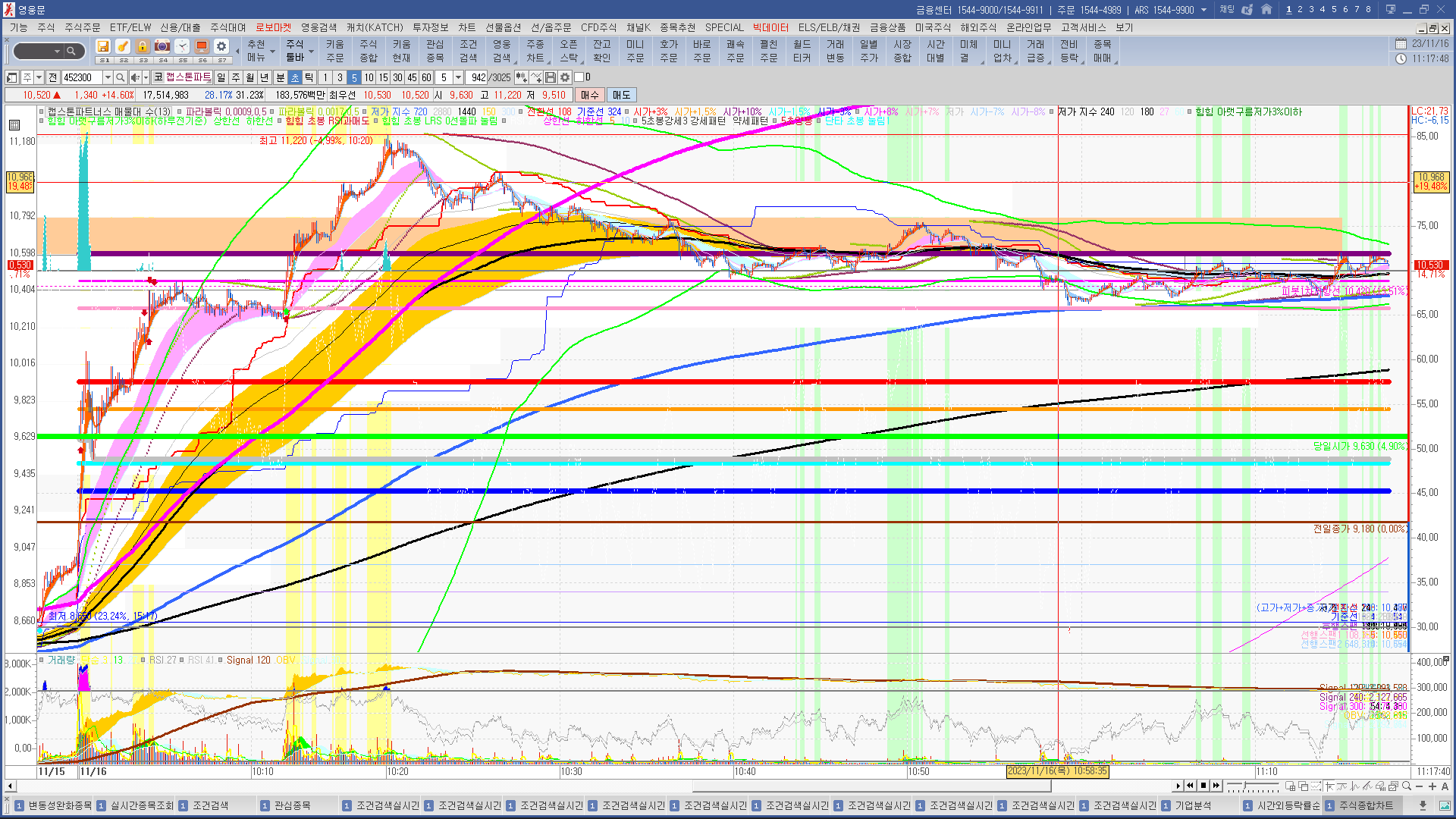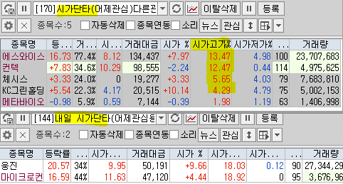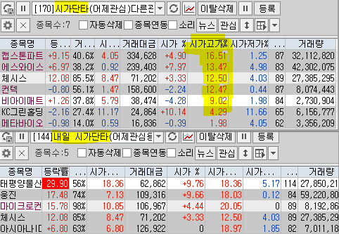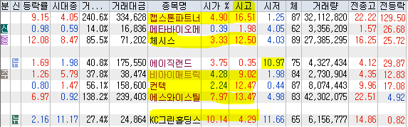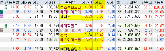 | 시가단타(1~3%) : 캡스톤파트, 메타바이오메드, 체시스 + 에이직랜드, 비아이매트릭스, 컨텍, 에스와이스틸텍 - KC그린홀딩스 | |||