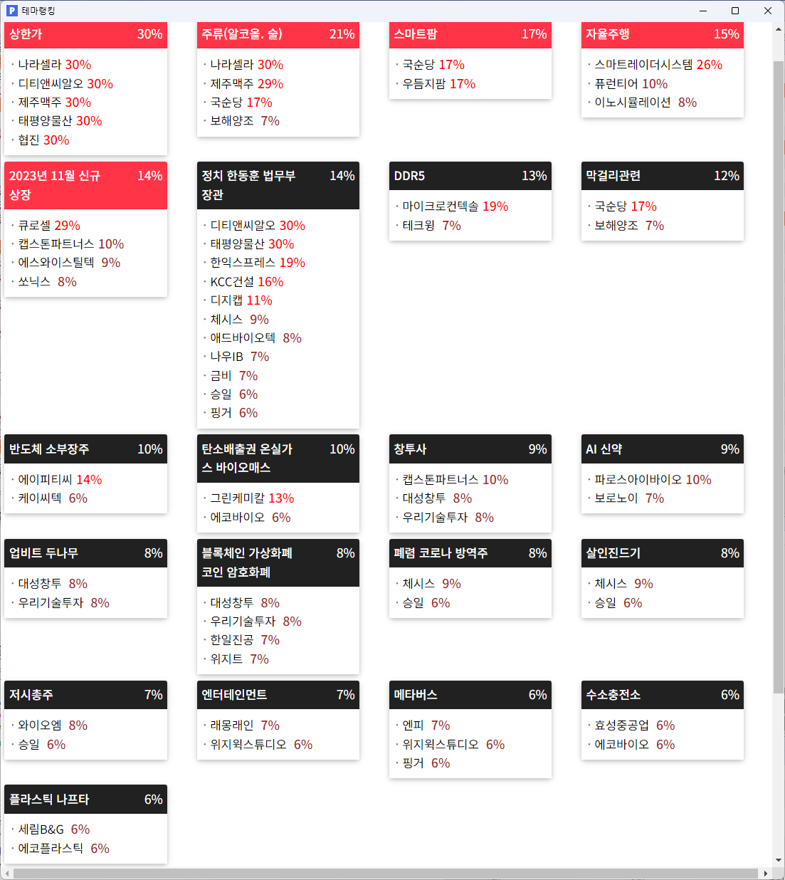 19. 에이치앤비디자인 (14.89%) : 휴대폰부품관련주, 시총200억대, 보조배터리&소형가전&부동산대행사업, 제3자배정 유상증자 진행, 법적 분쟁 등, 개별 등락