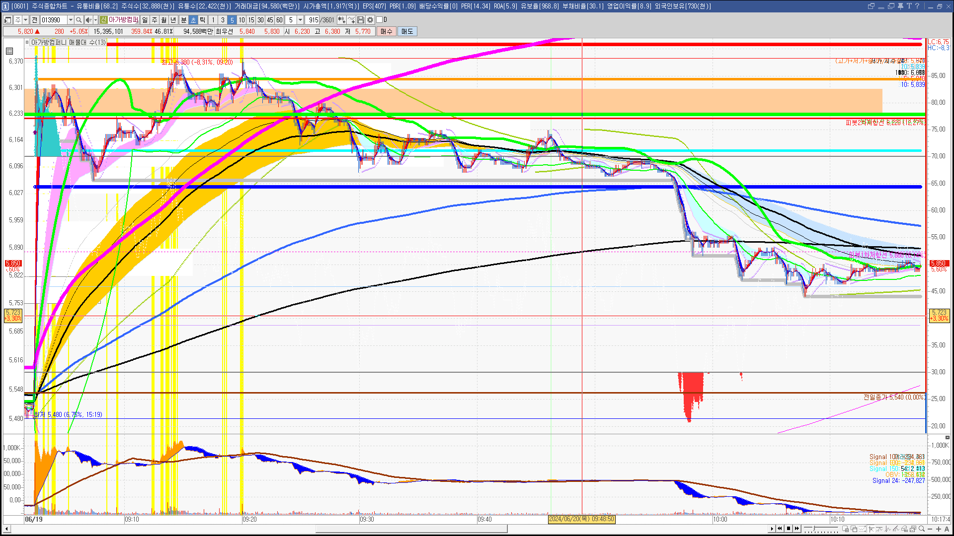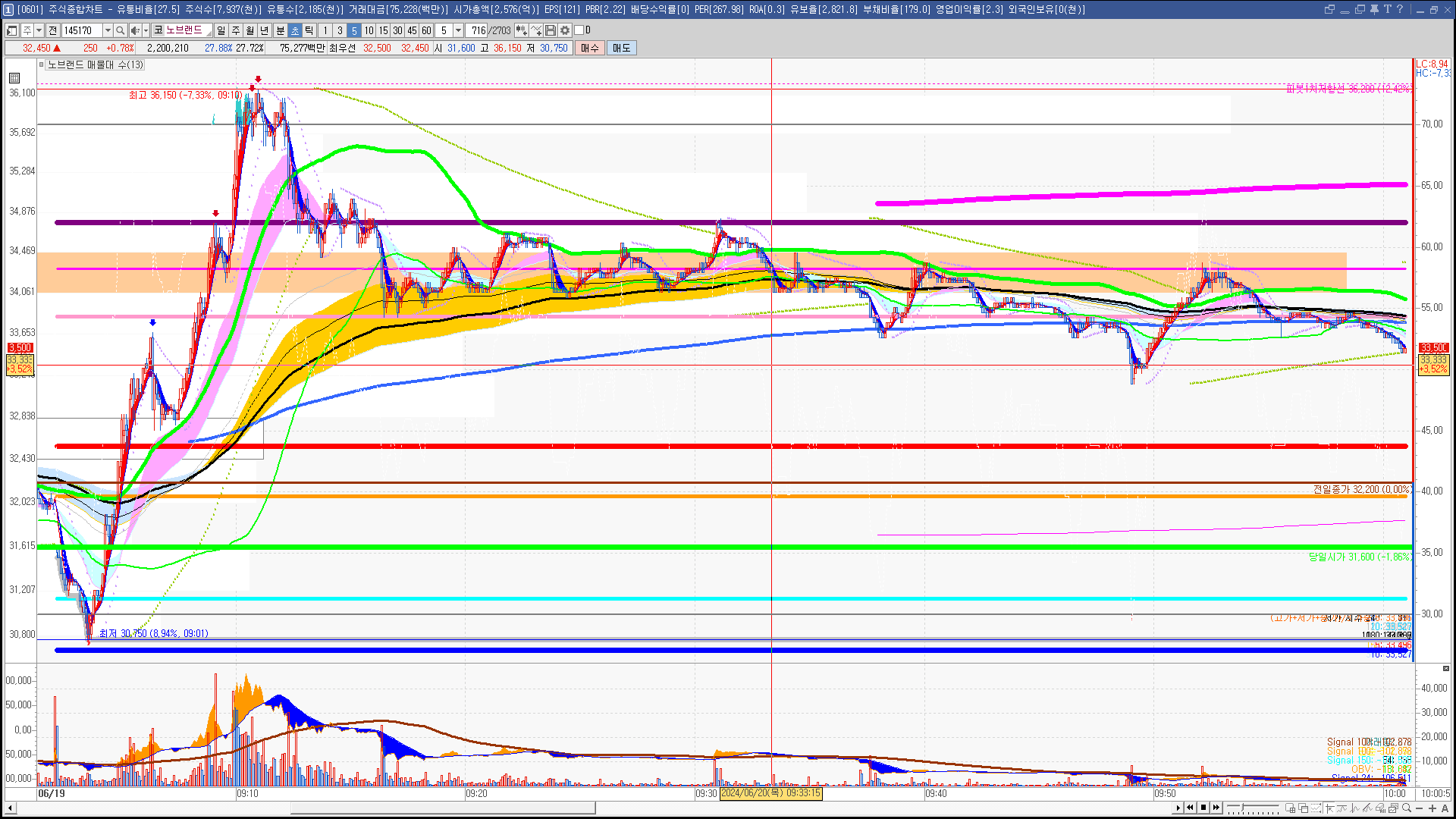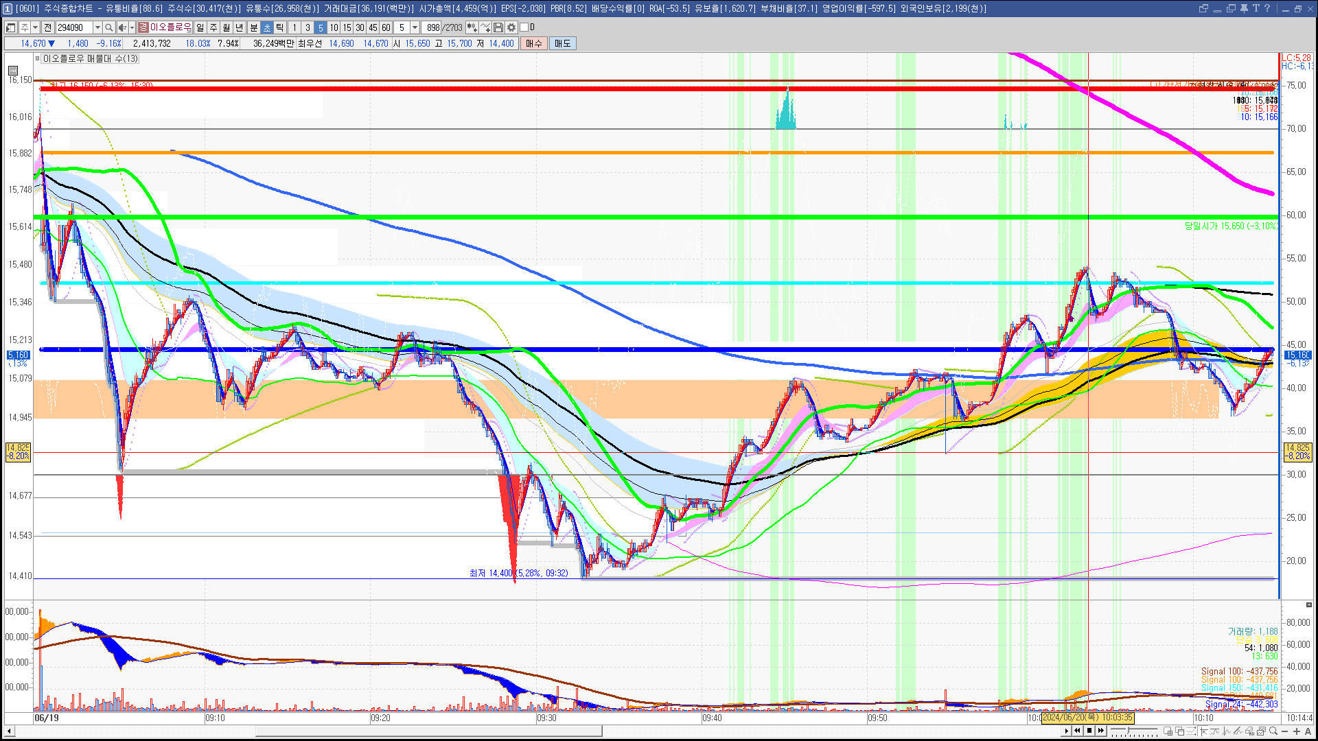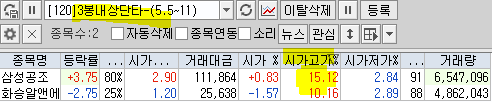 | 빨강 3% | 주황 1.5% | 녹색 시가 | 옥색 -1.5% | 파랑 -3% | 회색 저가 | 갈색 전일종가 | 장미7% | 분홍8.5% | 보라 10% |