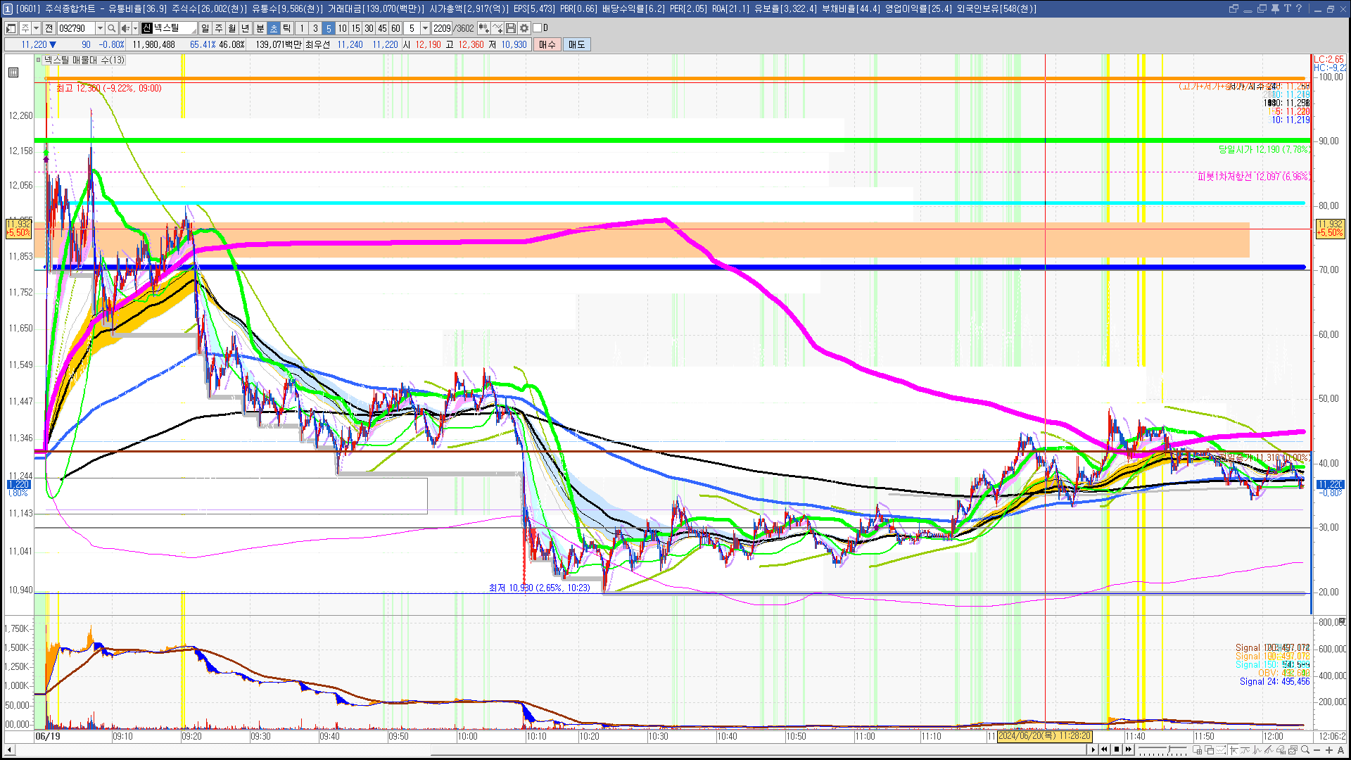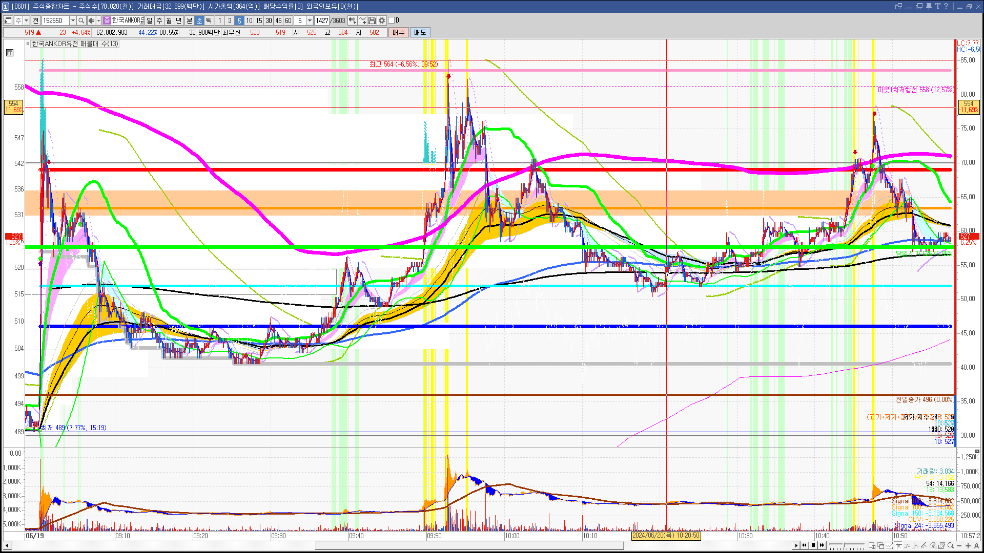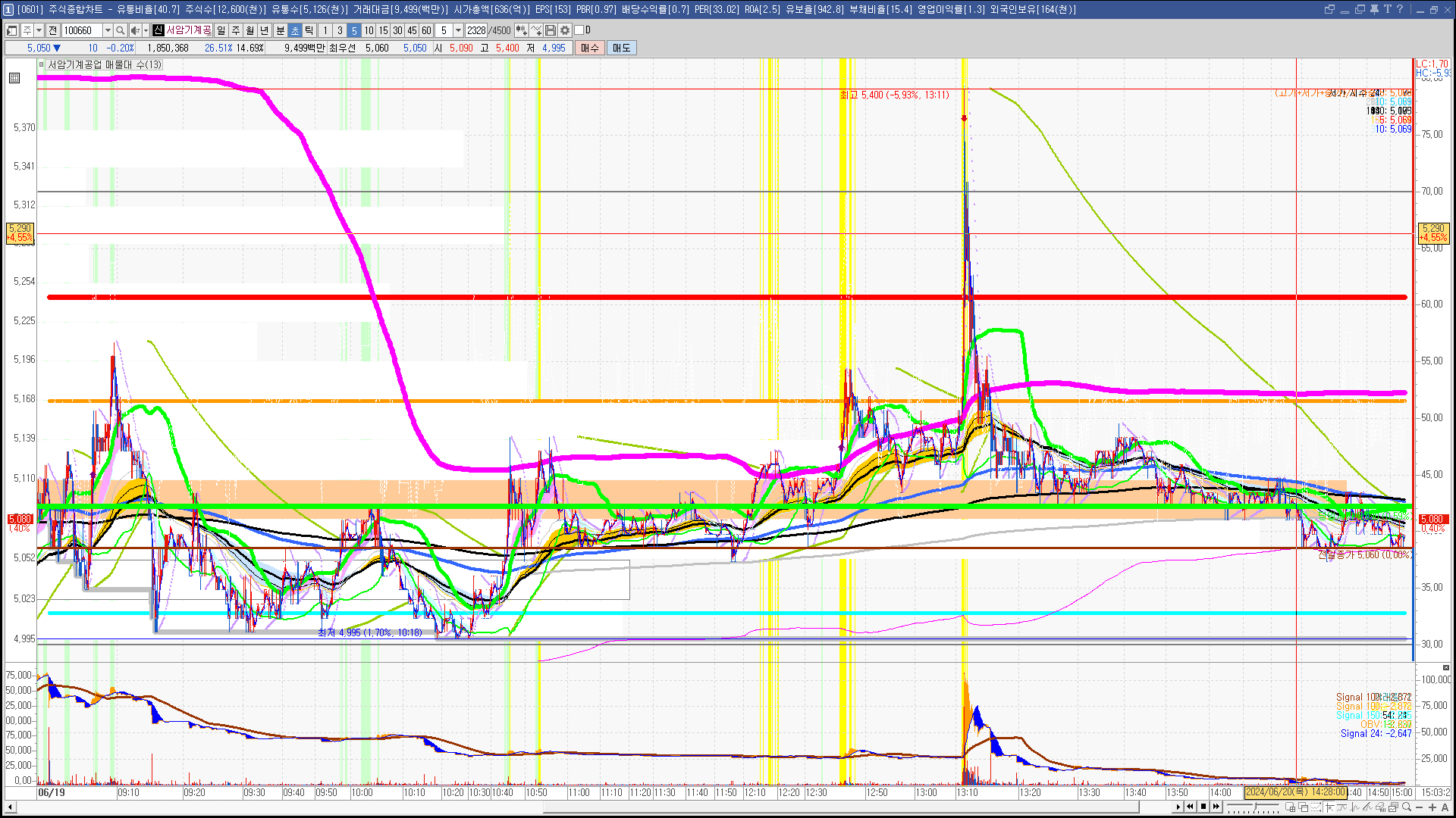 | 빨강 3% | 주황 1.5% | 녹색 시가 | 옥색 -1.5% | 파랑 -3% | 회색 저가 | 갈색 전일종가 | 장미7% | 분홍8.5% | 보라 10% |